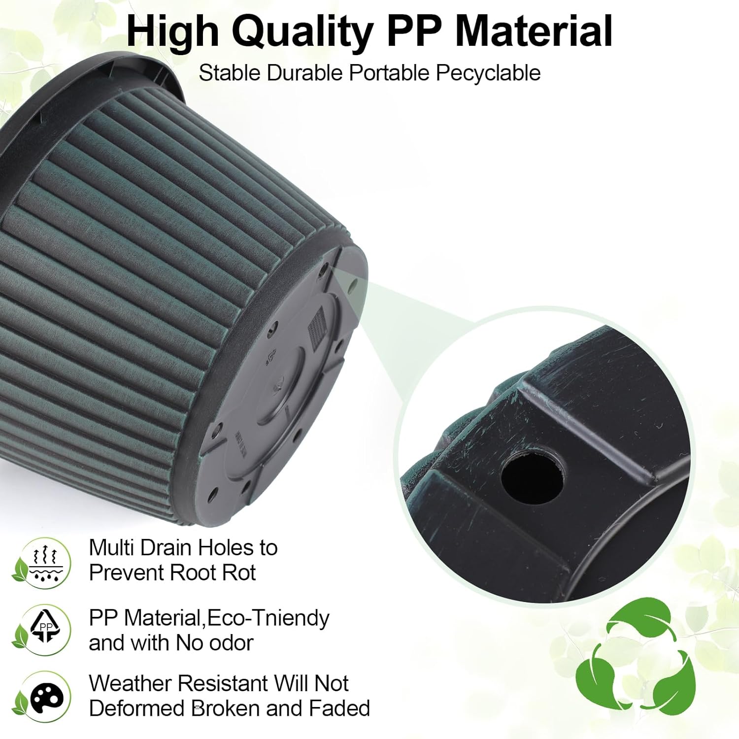 • 【Perfect Size & Sturdy Material】Top diameter: 10 inch, bottom diameter: 6.57 inch, height: 6.4 inch, capacity: 1.34 gallon. Plastic plant pots are made of recyclable polypropylene resin which is lightweight but sturdy, not easy crack. These indoor outdoor planters are UV and weather resistant. 10 inch flower pot is perfect for planting medium to large sized plants.