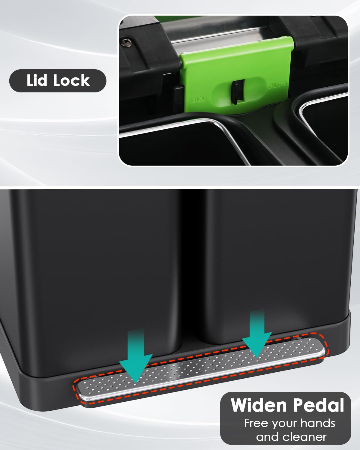 Arlopu 16 Gallon Dual Trash Can, 60L(2x30L) Stainless Steel Kitchen Garbage Can, Step-on Classified Recycle Garbage Bin with Removable Inner Buckets, for Kitchen, Living Room, Office (Black)