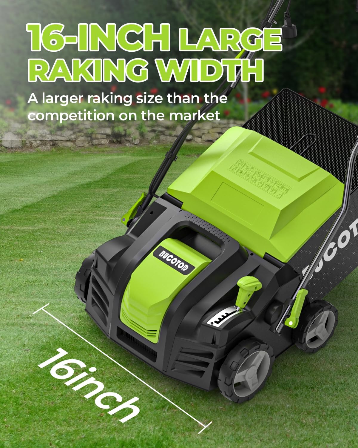 2-in-1 16-Inch Dethatcher & Scarifier Electric Corded, 15 Amp Copper Motor, Electric Lawn Dethatcher with 5-Position Depth Adjustment, 14.5 gal Thatch Bag,Walk Behind for Yard Lawn Garden Care