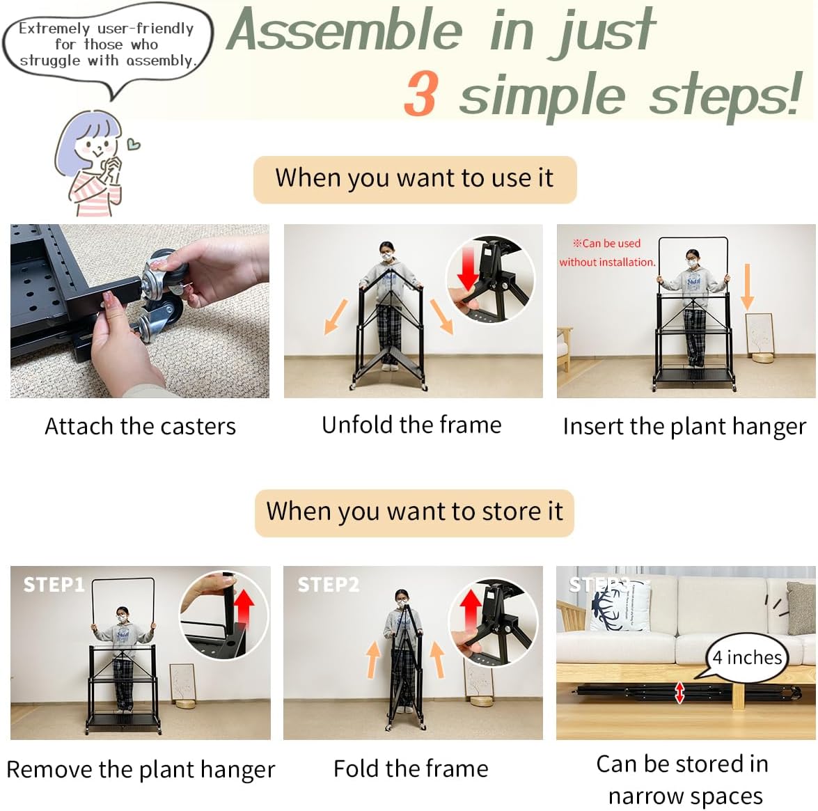 • [Foldable, Quick Assembly] Due to the absence of any complex conventional assembly, even first-time users of the plant stand can easily get started with a simple three-step process. With a folded thickness of only about 4 inches, it can be conveniently stored in gaps when not in use.