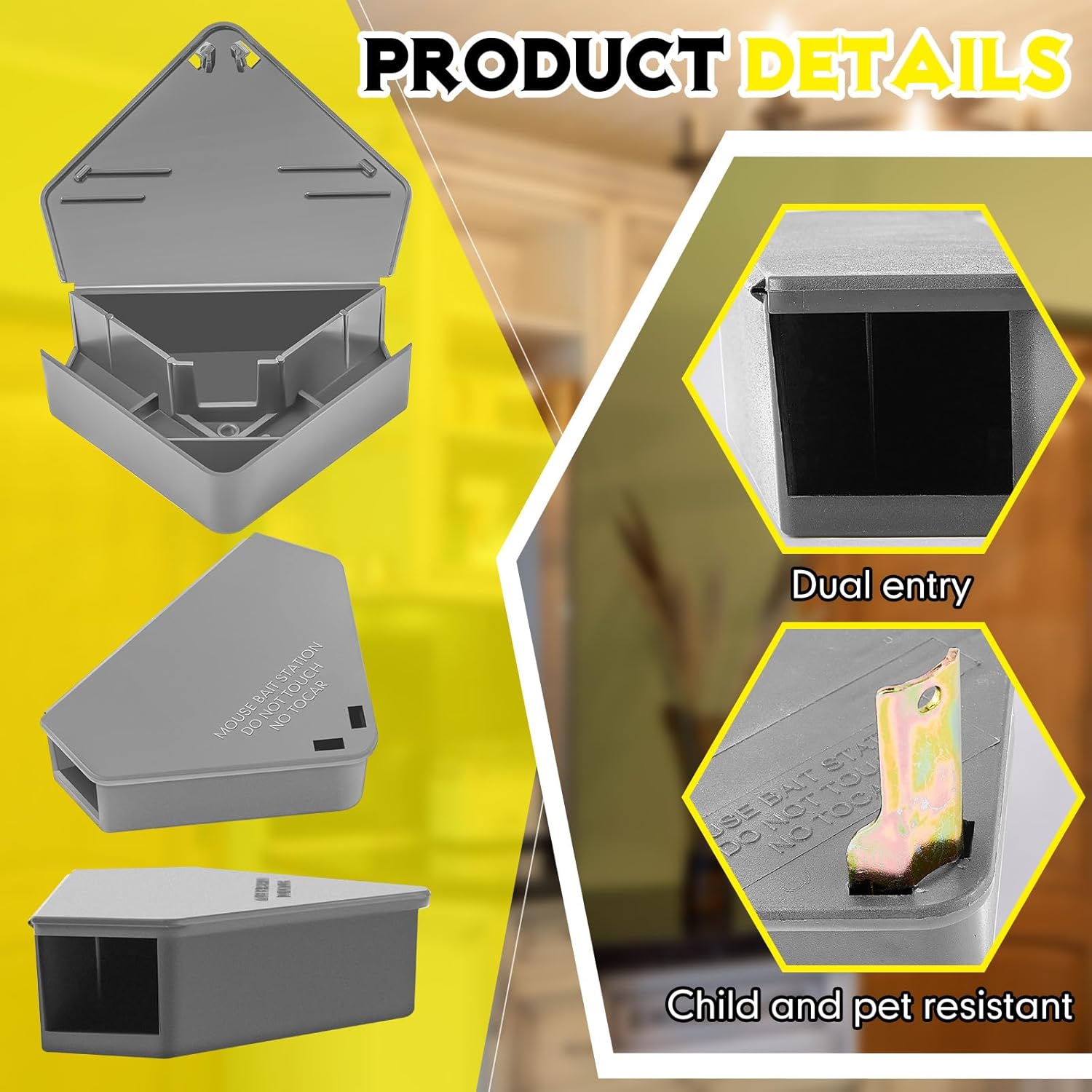 • Triangle Design: the mouse station is designed in a triangle shape, which is stable and safe, suitable for placing in small spaces, corners and under furniture;Please note: The mouse trap station will not catch mice directly, please use it with poison bait