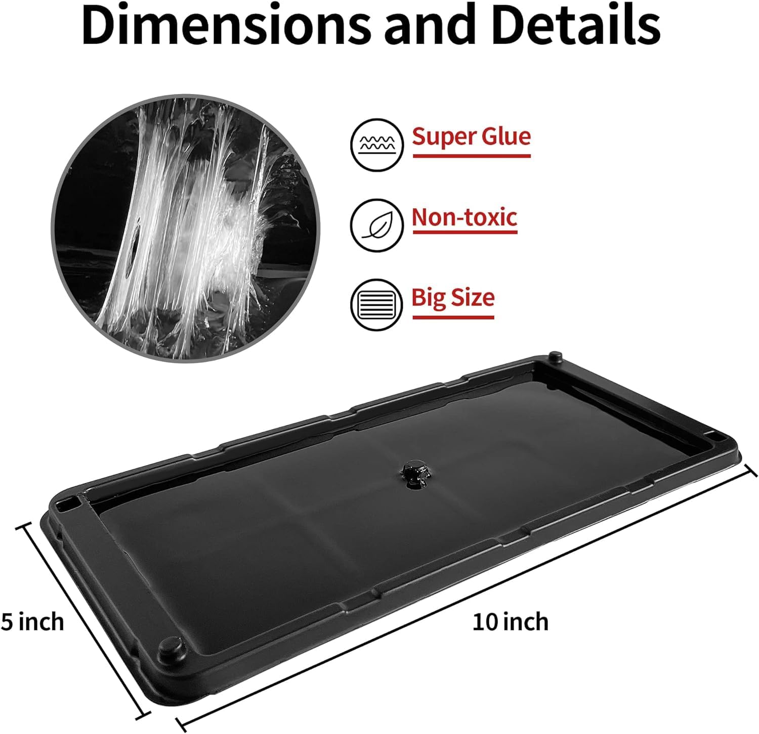 • Wide Application: These large and heavy-duty 5" x 10" trays come out as pairs, traps can be placed in areas where the mice are most likely to run, along walls, or skirting boards where pests are active. Ideal for the basement, residences, warehouses, restaurants, houses, indoor, industrial buildings, and attic use. Actually effective in catching everything from snakes, mice, rats, lizards, crickets, scorpions, spiders and etc.