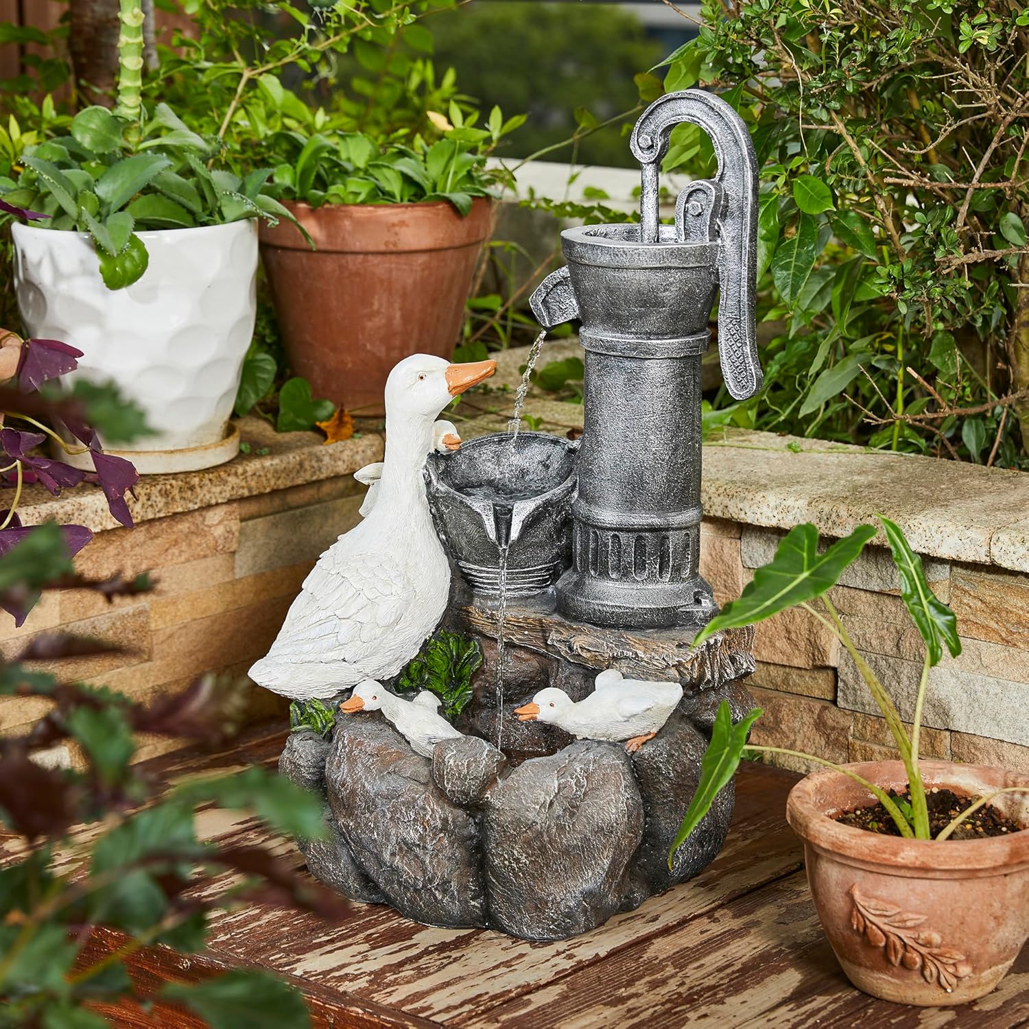 • Durable & Stylish Polyresin Outdoor Fountain --- This durable, weather-resistant duck water fountain. Made from a sturdy blend of polyresin and stone powder, it’s built to withstand harsh outdoor conditions while maintaining its beauty season after season. The lifelike stone texture and gentle water flow create a calming atmosphere while complementing any outdoor decor.