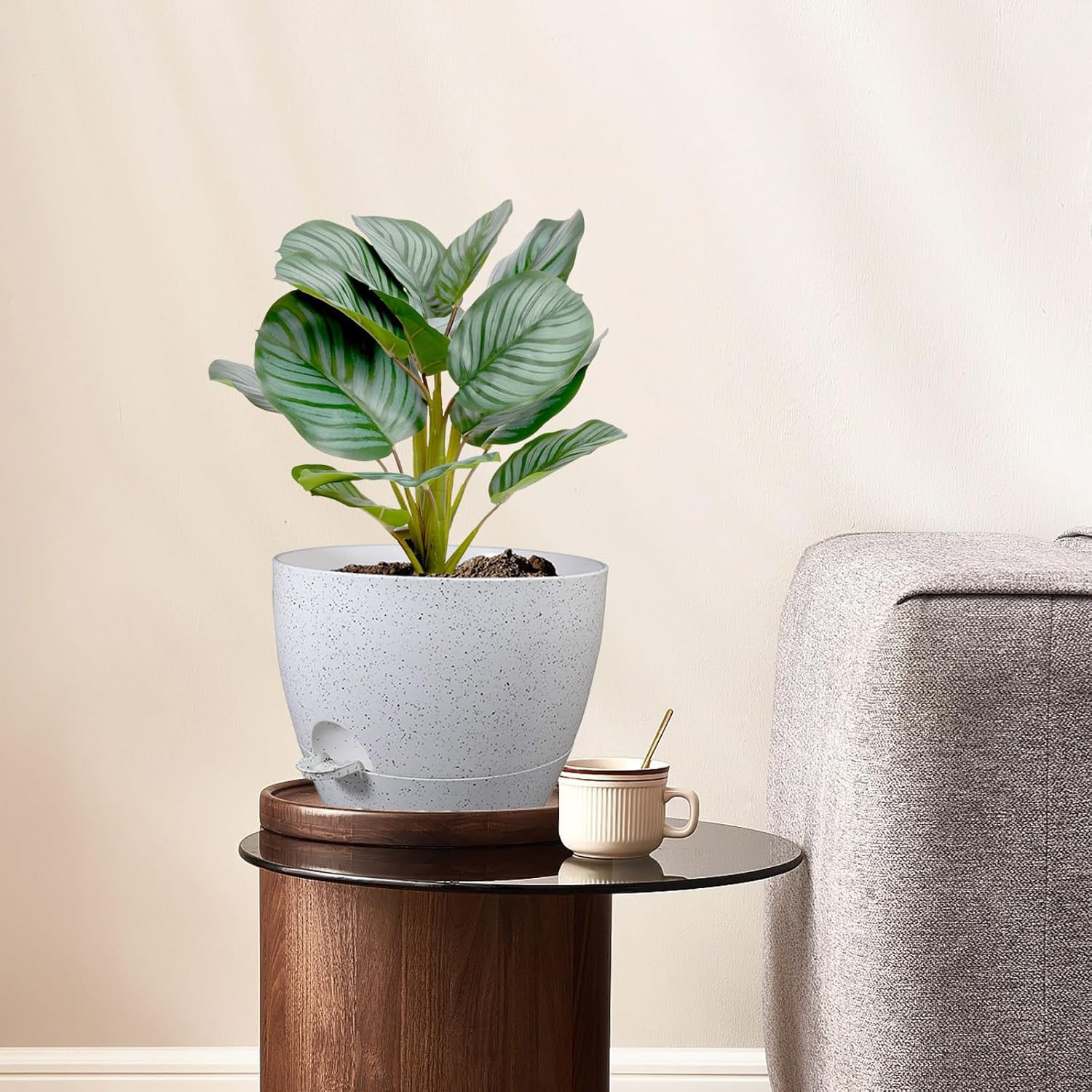 10 inch Self Watering Pots, Planter, Plant Pots with Mesh Drainage Holes for Indoor Outdoor House Plants and Garden, Set of 2 Plastic Flower Pots with Deep Reservoir, Speckled White