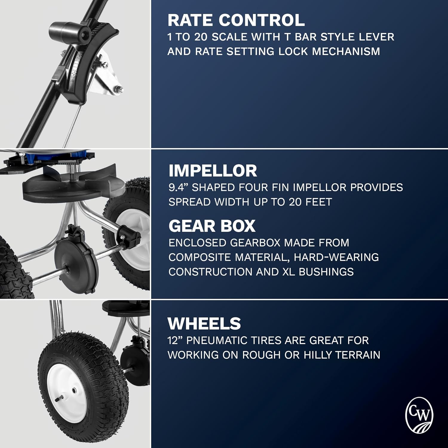 • Spread to Your Needs: Spread width is approximately 20 feet, with an adjustable-rate control from a 1 to 20 scale, and includes an adjustment plate for left and right pattern adjustment.