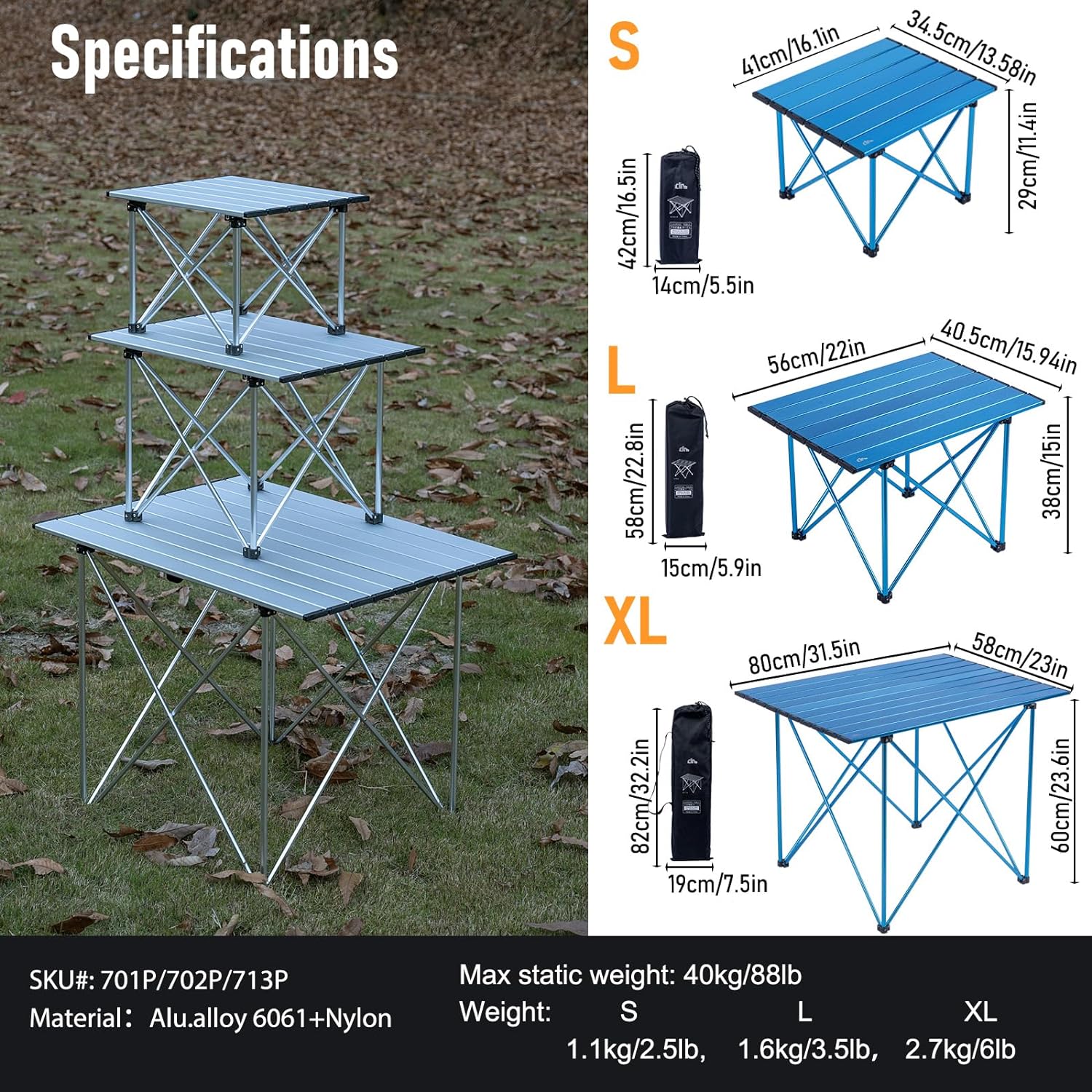 • Ultralight, made of aerospace-grade aluminum alloy, only 2.5 lbs; Max Load 88 lbs; Unlike wooden or nylon-top tables, this table is durable, waterproof, corrosion-resistant, easy to clean; Sturdy joints and anti-slip feet keep the table stable, with legs that won’t fold, bend, or slip on any terrain; Very easy to set up, just open the base frame and attach the tabletop, enjoy your leisure time in seconds, video guide available on this page.