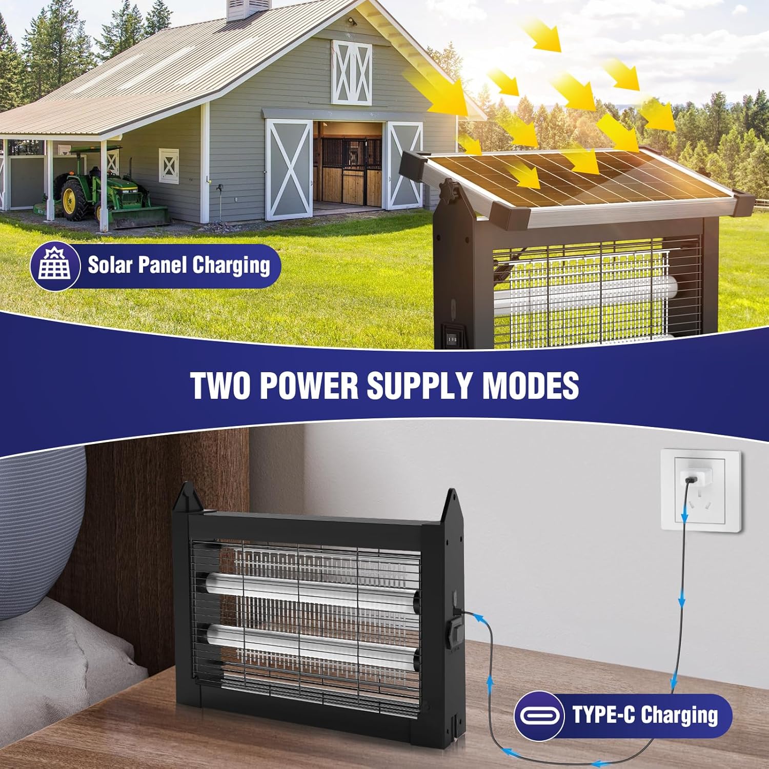 • Diverse Power Supply Options: The solar bug zapper outdoor is designed with three effective power supply methods: a 10 W 5V solar panel, a Type-C cable, and a rechargeable battery. The fly zapper's battery charges in 4-6 hours, with an indicator changing from red to green when fully charged.A single charge can last about 12 hours. Outdoor bug zapper features an adjustable solar panel for optimal light exposure. When using outdoors, cover the charging and switch ports to waterproof the device.