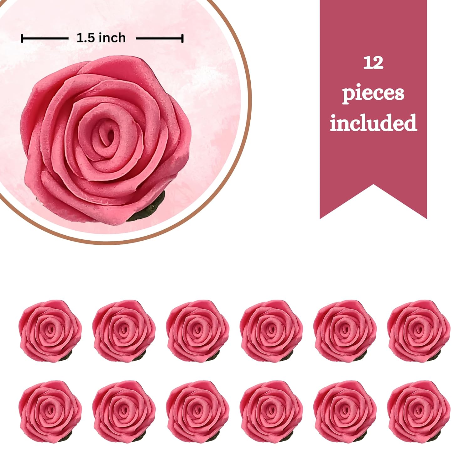 • Contains no floral wires making them safe to consume. Each pack contain 12 sugar roses – approximately 1.5 inches in size.