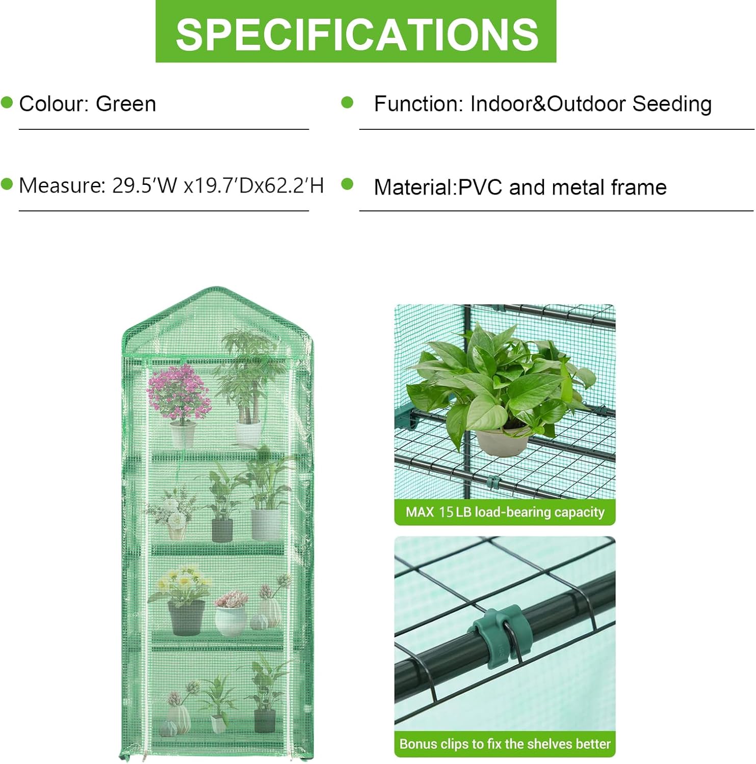 Oneness Mini 4-Tier Greenhouse, Indoor and Outdoor Reusable Portable Warm House with Green PVC Cover and Metal Shelf for Seeding in All Season, 29.5”W x 19.7”D x 62.2”H