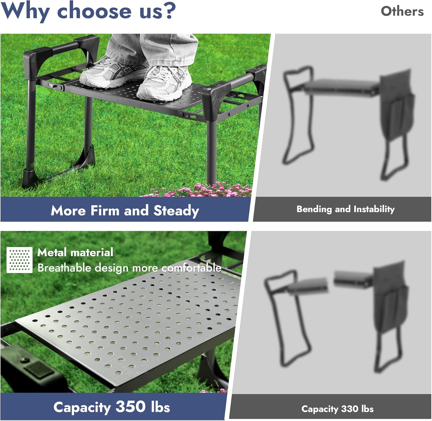 • 【Holds Up To 350 lbs! 】Gardening work seat is made of steel, which is stronger than the older generation. The reinforced design with four additional protective corners is more ergonomic and suitable for long-term gardening work.