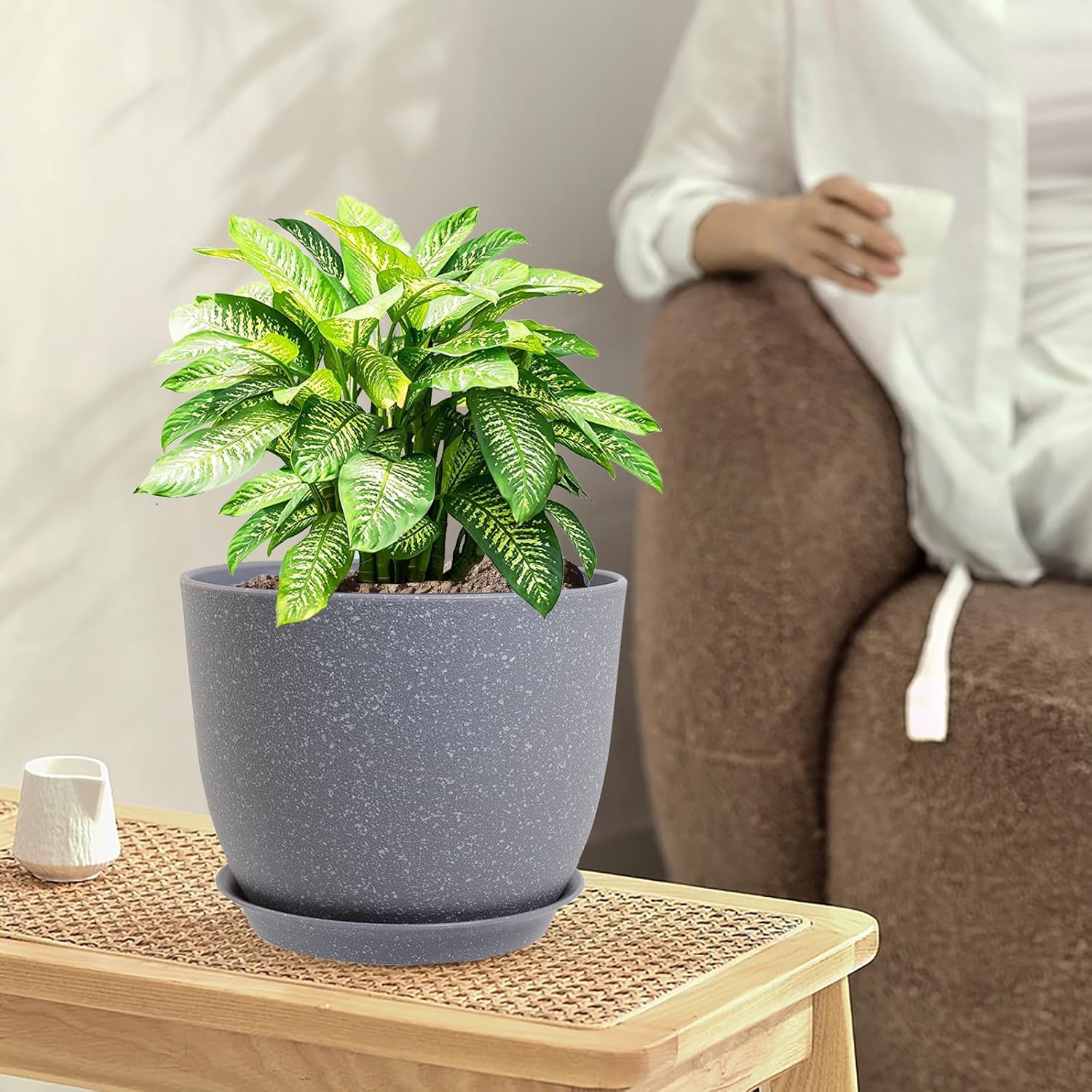 10/9/8 inch Plant Pots, Set of 3 Modern Decorative Plastic Planters with Drainage Holes and Saucers for Garden House Plants, Flower Pots for Indoor Outdoor Plants, Speckled Grey