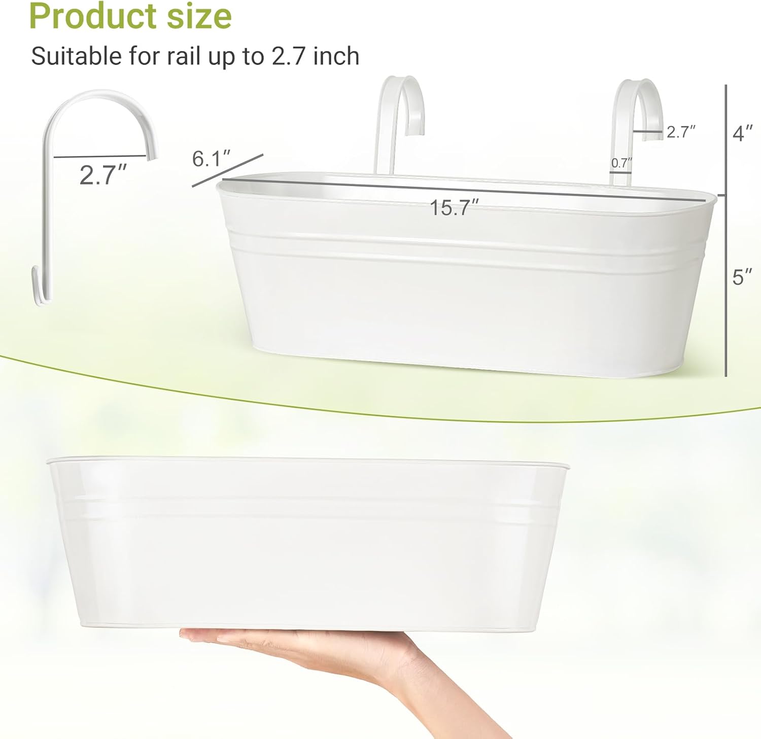 • Large Size: Planter:15.74" x 6.10" x 5". Hook is 4" x 2.7"x 0.7"(Suitable for rail up to 2.7 inch). Please check the size carefully before purchasing. Pay attention to:The hook is disassembled for transportation,you need to install the iron bucket yourself when it arrive.