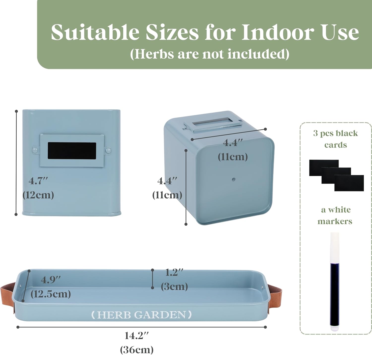 • 【Windowsill Herb Garden】Our window herb garden includes three pots and a tray with a handle, with each pot measuring 4.4" W x 4.7" H, and the tray measuring 14.2" L x 4.9" W x 1.2" H. It's ideal for growing a variety of herbs such as mint, rosemary, basil, thyme, etc. Tailored for herb growth, our indoor herb pots provide an optimal environment for nurturing your herbs. Their farmhouse design and compact size make them perfect for placement on a windowsill or kitchen countertop.