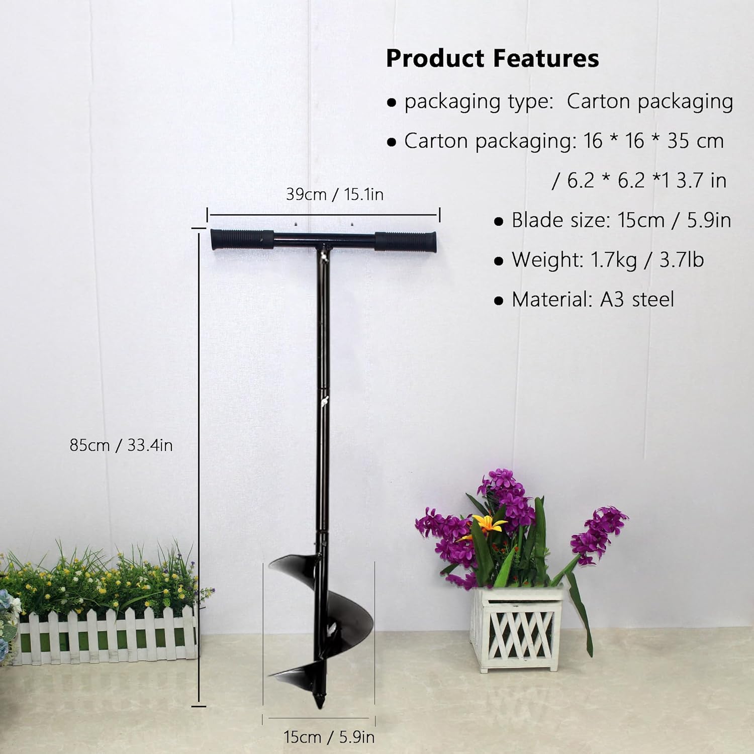 • [ Compost Tool ]- The tool is 33.4 inches in overall height and 5.9 inches in width at the spiral portion, which is rust and corrosion resistant. The smooth surface makes cleaning after composting easy and less troublesome