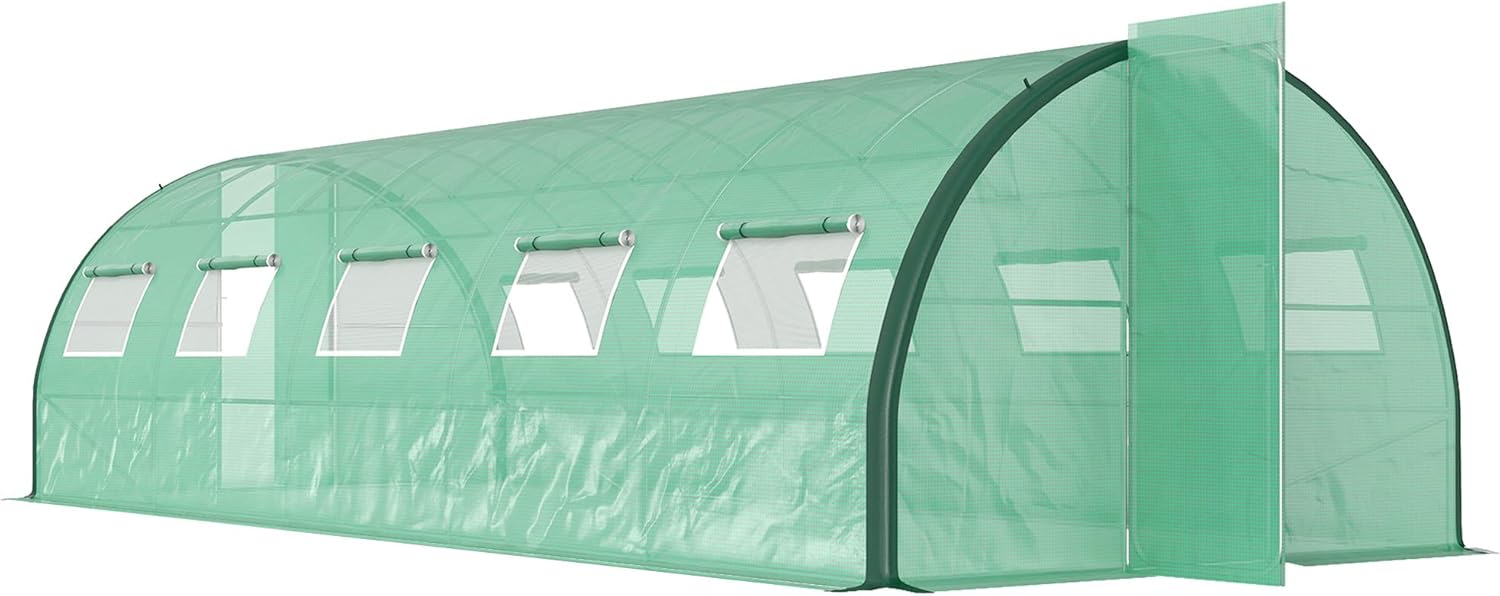 Outsunny 25' x 10' x 6.6' Walk-in Tunnel Greenhouse with Upgraded Structure, Outdoor Green House with 2 Hinged Doors, 10 Mesh Windows, Gardening Plant Warm House Tent, Green