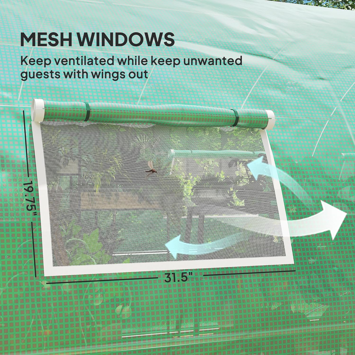 • Windows & Doors: Enjoy easy access to your outdoor greenhouse with hinged doors large enough to walk in and out with supplies. For more fine-tuned ventilation, open the 10 windows so heat and humidity are in your hands. They're mesh-protected, keeping unwanted winged things away.