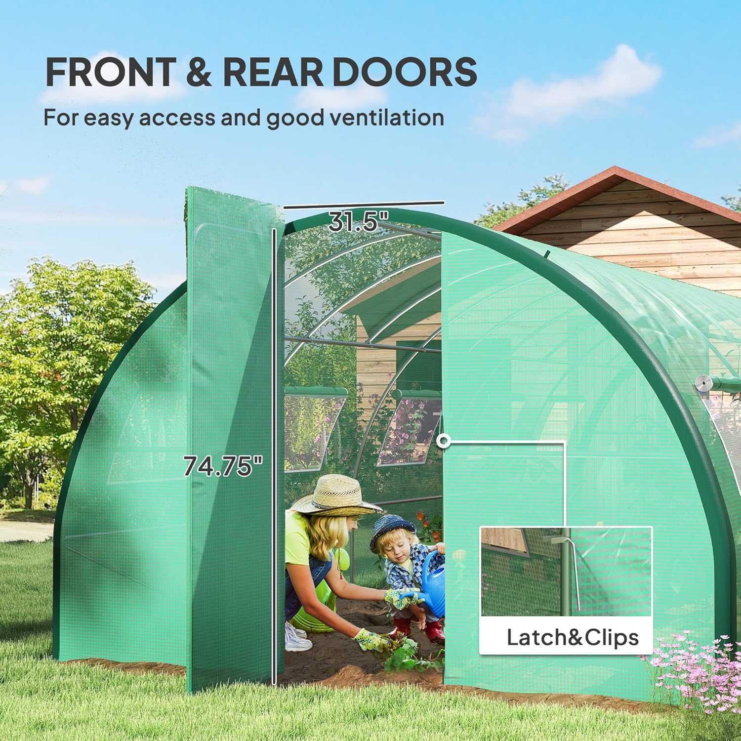 • Large Walk-in Outdoor Greenhouse Info: Overall Dimensions: 295.25" L x 118" W x 78.75" H. Door Size: 31.5" W x 74.75" H. We recommend two to three people to assemble it.