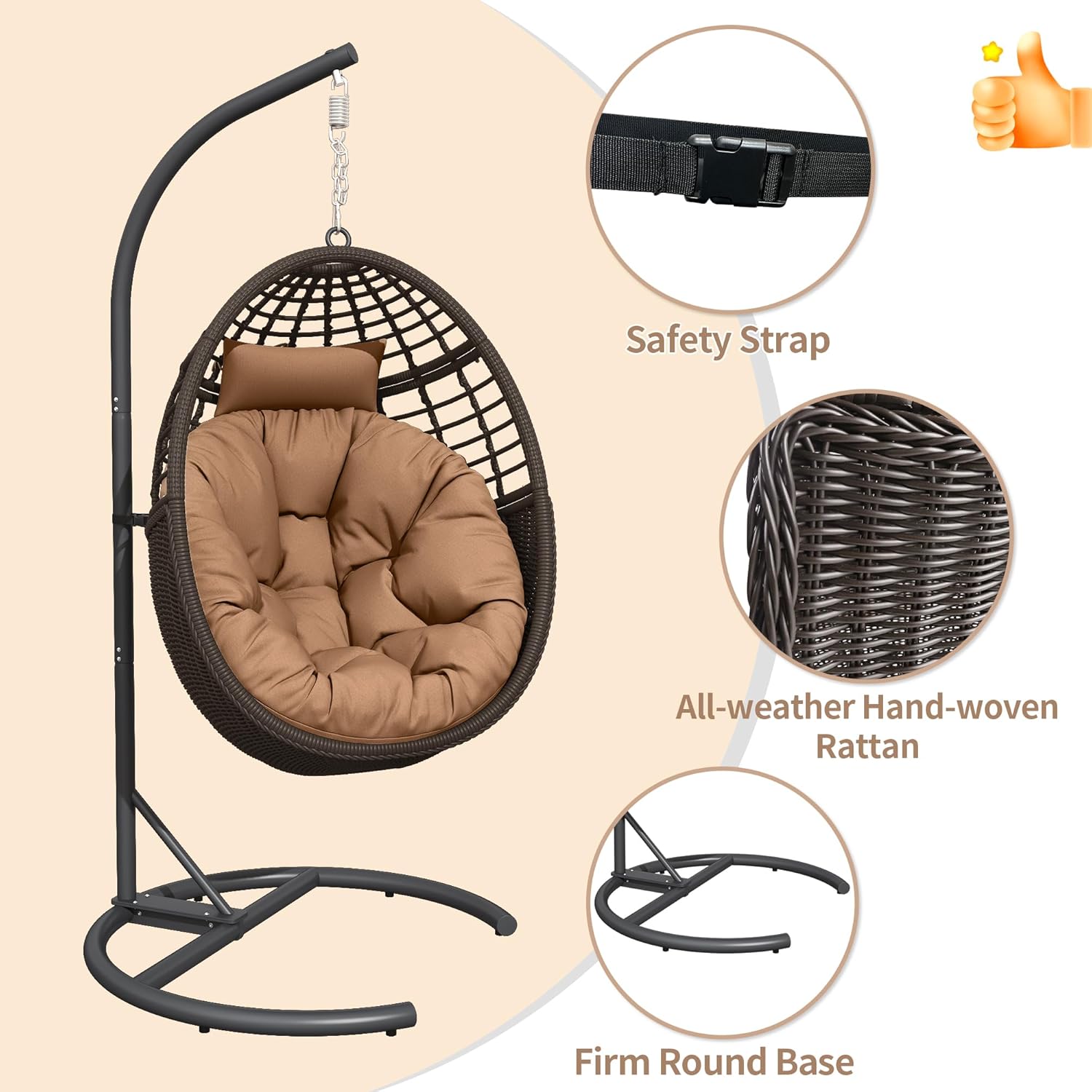 TWT Egg Swing Chair with Stand Rattan Wicker Hanging Egg Chair for Indoor Outdoor Bedroom Backyard Hammock Egg Chair with Metal Frame and UV Resistant Cushion 330lbs Capacity-Dark Brown