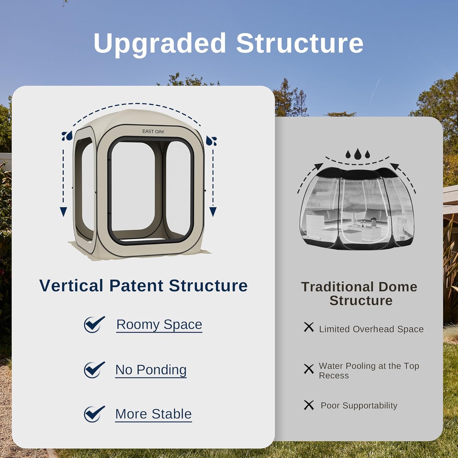 • ๐—•๐˜‚๐—ด๐˜€-๐—ฃ๐—ฟ๐—ผ๐—ผ๐—ณ ๏ผ† ๐—ฉ๐—ฒ๐—ป๐˜๐—ถ๐—น๐—ฎ๐˜๐—ฒ๐—ฑ ๐—ฆ๐—ฝ๐—ฎ๐—ฐ๐—ฒ : The EAST OAK portable pop-up screen tent features a 4-sided B3 fine mesh design for 360ยฐ perfect ventilation and can protect you from mosquitoes or other bugs. The tent body is made of high-quality Oxford fabric coated with silver to achieve all-day UPF 50+ UV resistance. Ideal for creating a comfortable and protected resting space during various outdoor activities (picnics, camping)