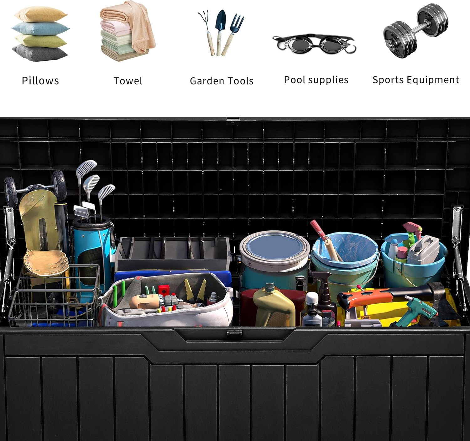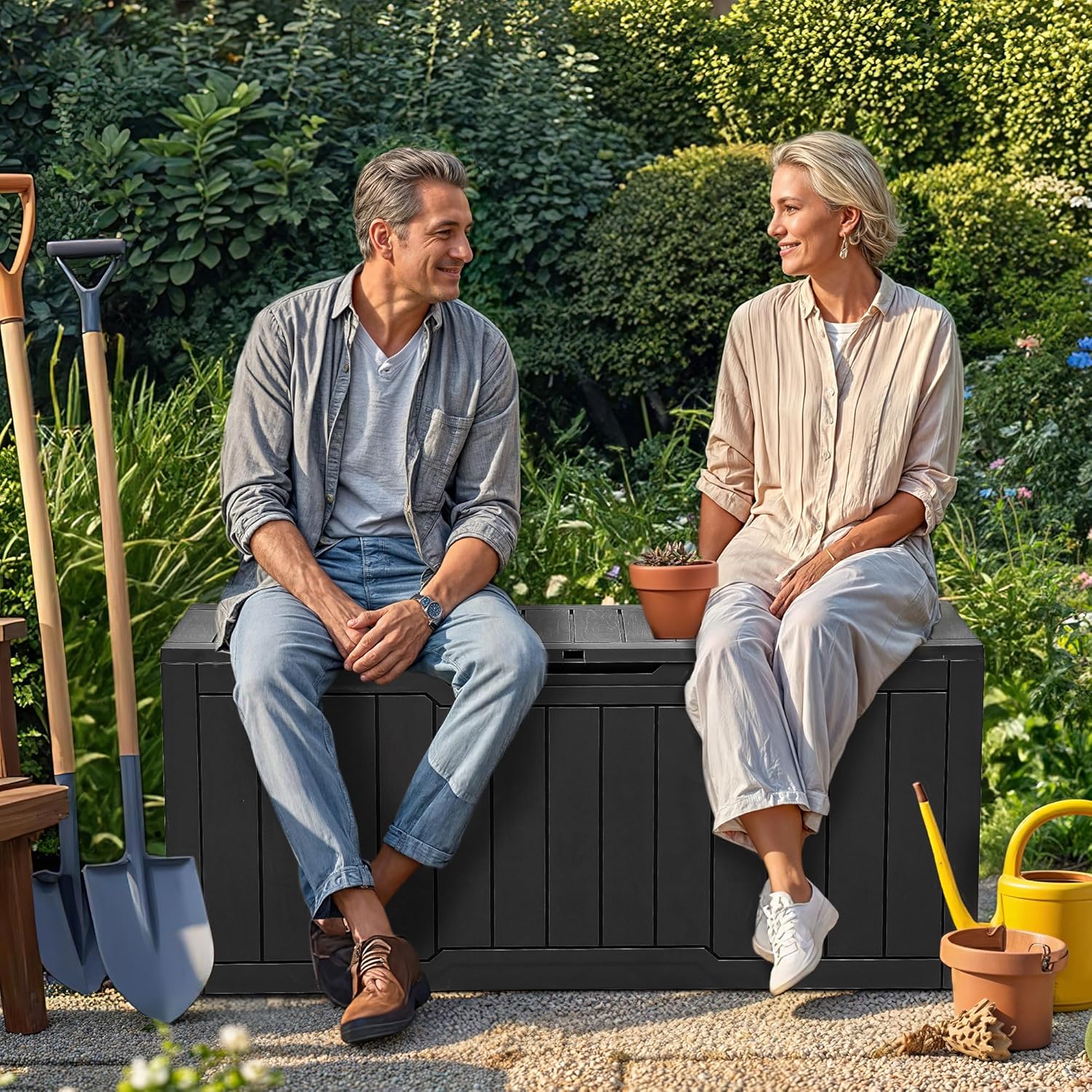 • Versatile Garden Storage: This resin deck box serves as an additional table or bench that can accommodate two peoples weighing up to 300 pounds total; It seamlessly blends into any yard or patio, and conveniently stores outdoor patio furniture cushions, tools, rain gear, and pool supplies