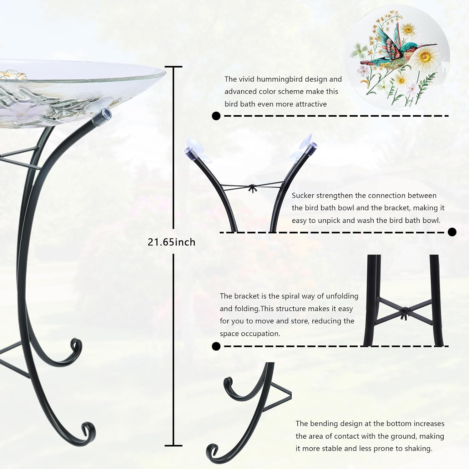 • Easy to place and clean: The folding bracket of the outdoor glass bird bath is designed to be easily stored and moved, and can be placed anywhere you want. The high quality coating on the glass surface allows you to easily remove bird droppings or dirt