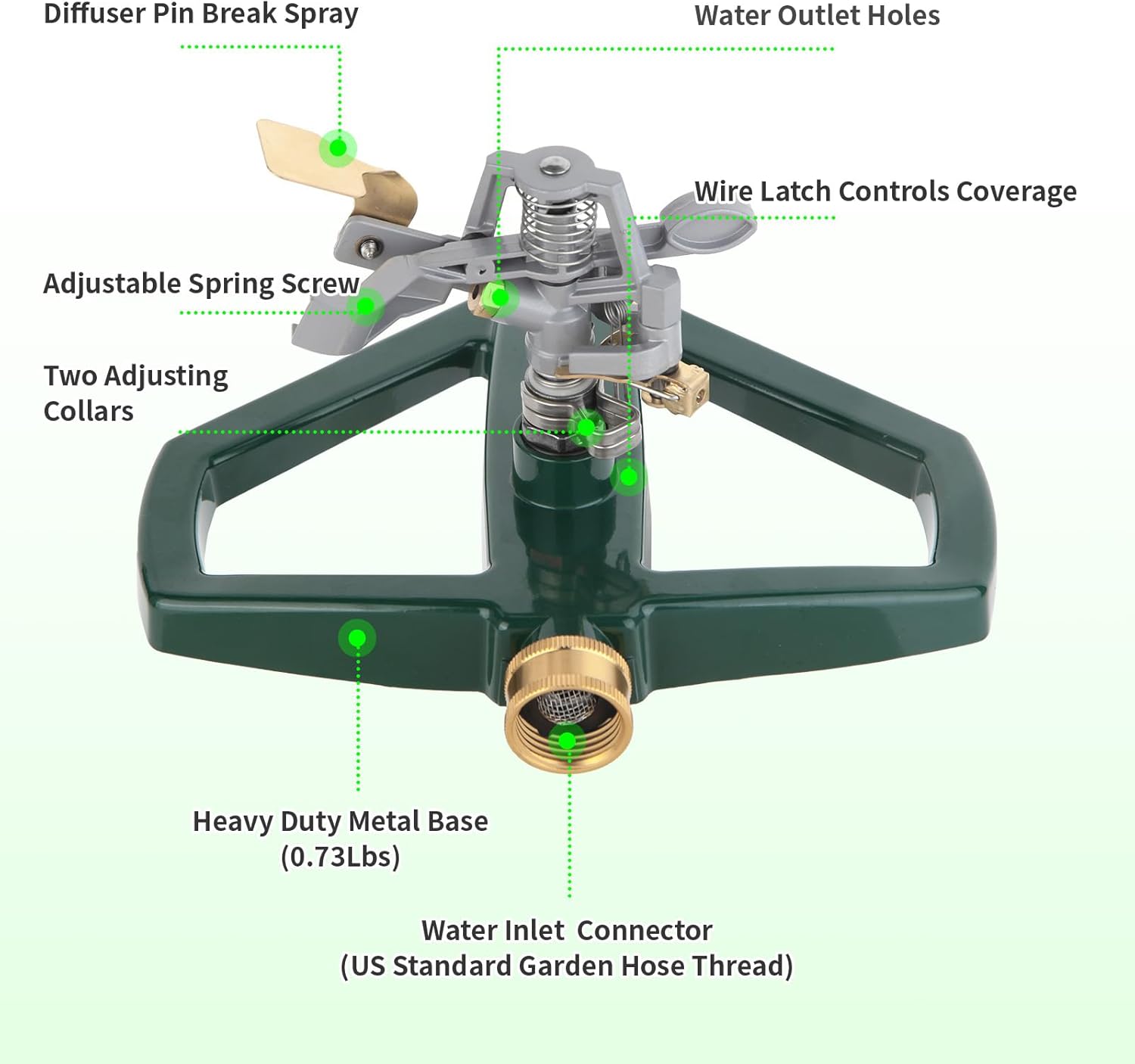 • 【Heavy Duty Base Design】: Smooth zinc alloy paint surface ensures the lawn sprinkler's corrosion and wear resistance for many years. The sprinkler system's modest weight and sturdy construction provide unparalleled reliability, with additional ground studs designed to prevent any accidental tipping.