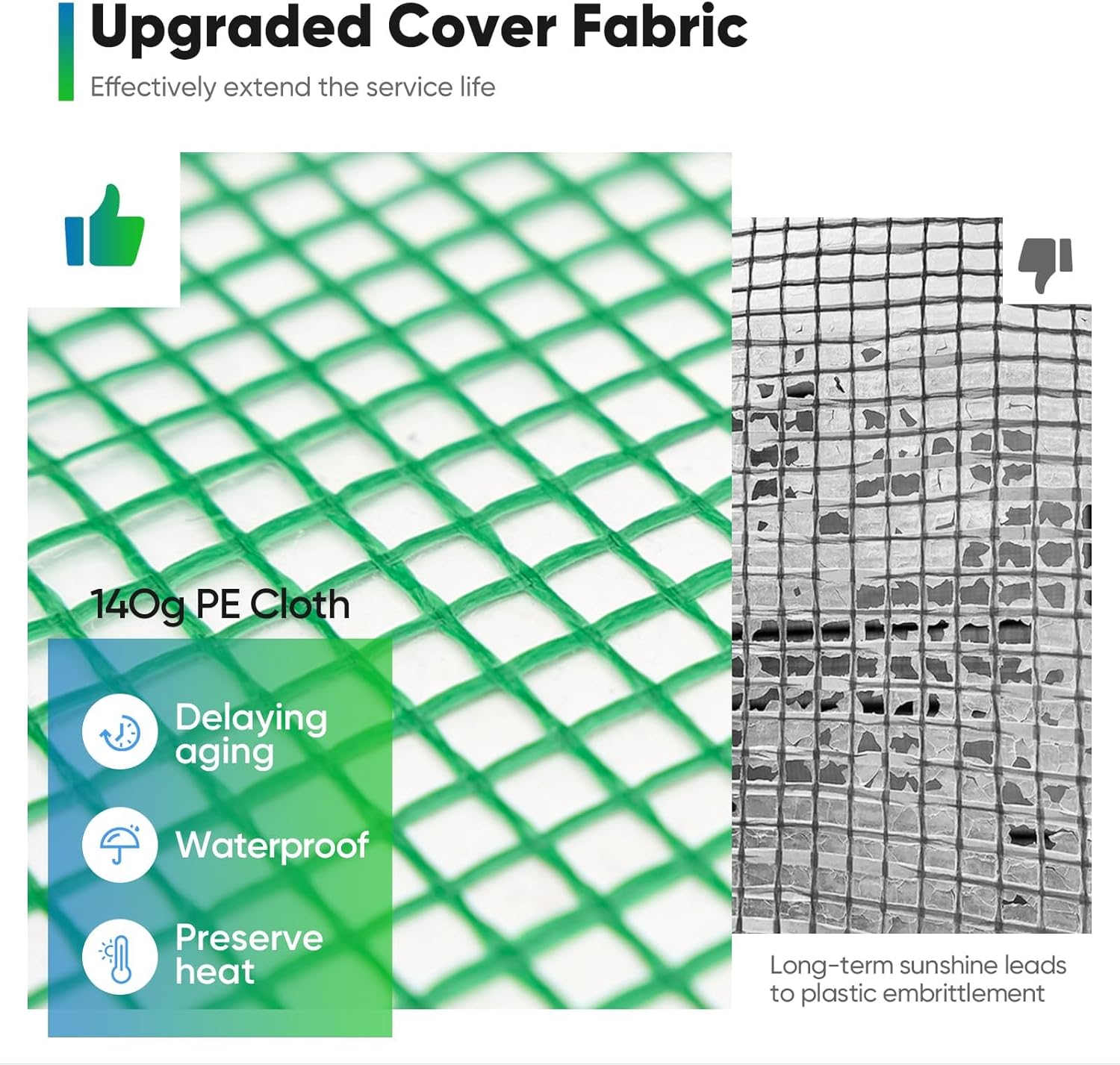 • UV Protected Durable Cover - Odorless waterproof PE cover meets the UVI level 6 standard, protecting plants from sun burnt. For PE Cover Edging design, you can put weights down to seal the bottom or just bury it in the soil for heat preservation, air tightness, humidity and temperature. 3-layer stitching cover can effectively avoid tearing during use.