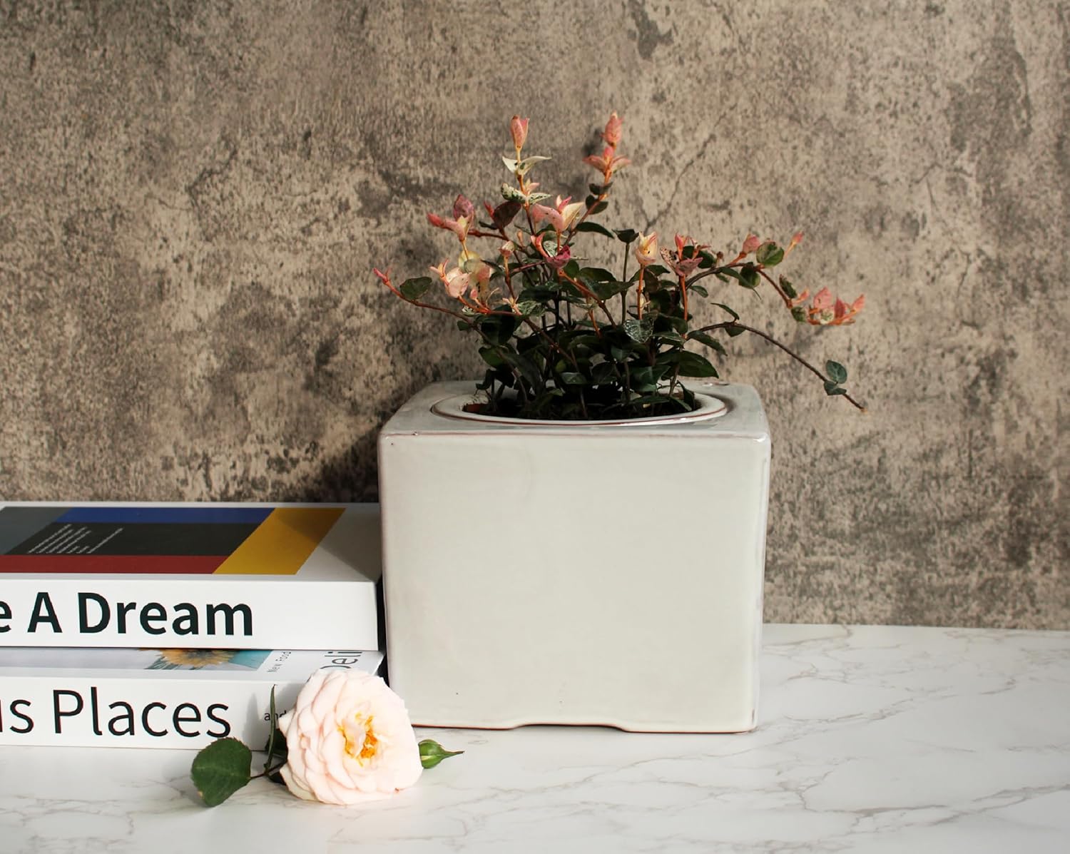 Ceramic African Violet Self Watering Pot 6 Inch Square Pot 3.5 Inch Innter Pot Easy Fill Water Reservoir White