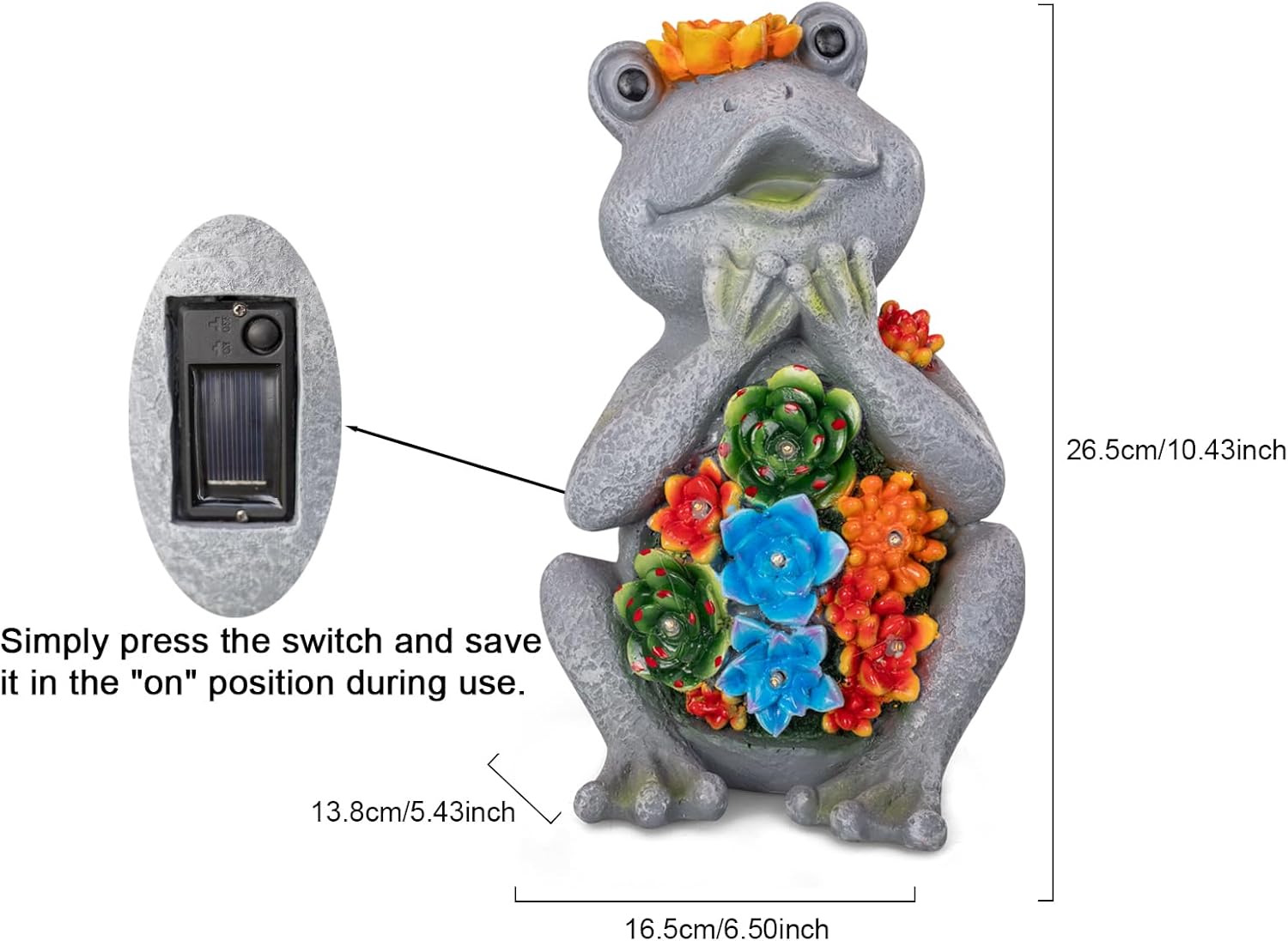 • 🐸Solar-Powered Radiance: 8 solar lights,Long bright 8-10 hours - one crowning its head and seven nestled amidst the vibrant succulents in its embrace. These eco-friendly lights charge during the day to illuminate with a light as dusk falls.