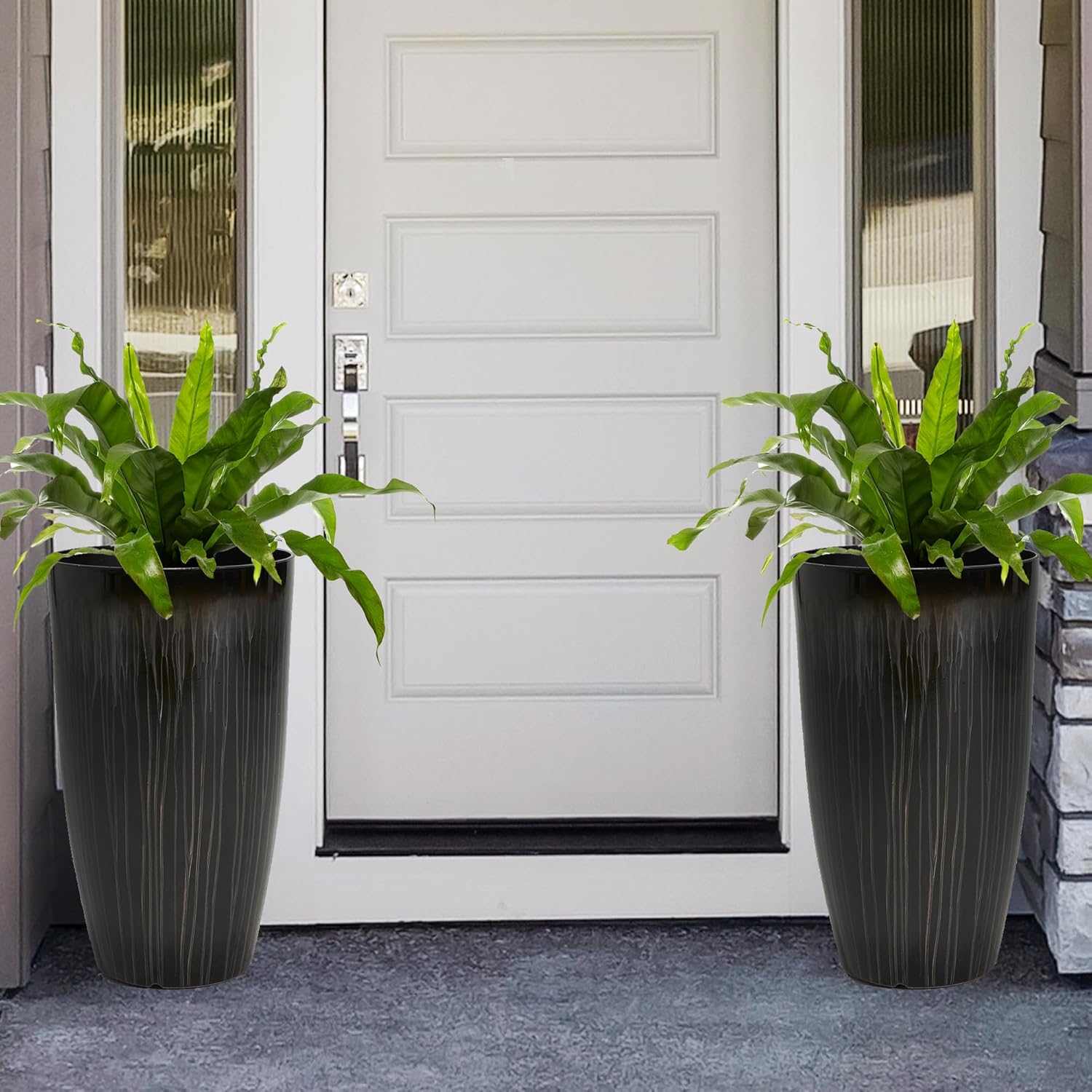 Worth Garden 23.5" H. Large Plastic Planters - Set of 2 Gradient Black Glossy Smooth Finish - Tall Plant Pots for Indoor & Outdoor Use - Decorative Lightweight Flower Pots for Front Porch, Patio, Deck