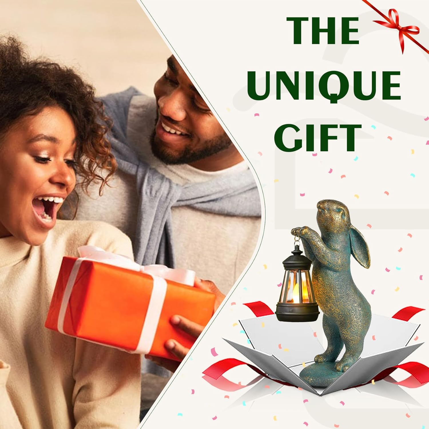 • Solar Rabbit: This bronze rabbit statue holds a solar lantern that emits a warm, welcoming glow. The light mimics a vivid, flickering flame. As a symbol of luck and prosperity, it's perfect for creating a cozy atmosphere in your patio, yard, or porch