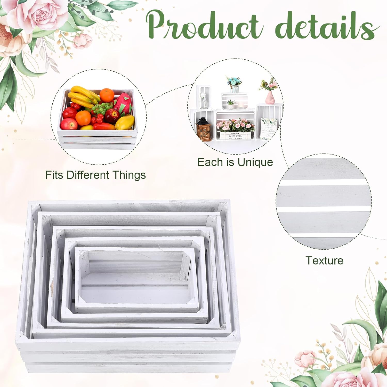 • Practical Handles and Nesting Design: the nesting design of these farmhouse wood crate boxes adds to their usefulness, allowing for easy and efficient storage when they're not in use; The inclusion of handles makes them convenient to maneuver around, fitting into your space seamlessly; These crates are a smart and versatile choice, offering practicality and storage optimization