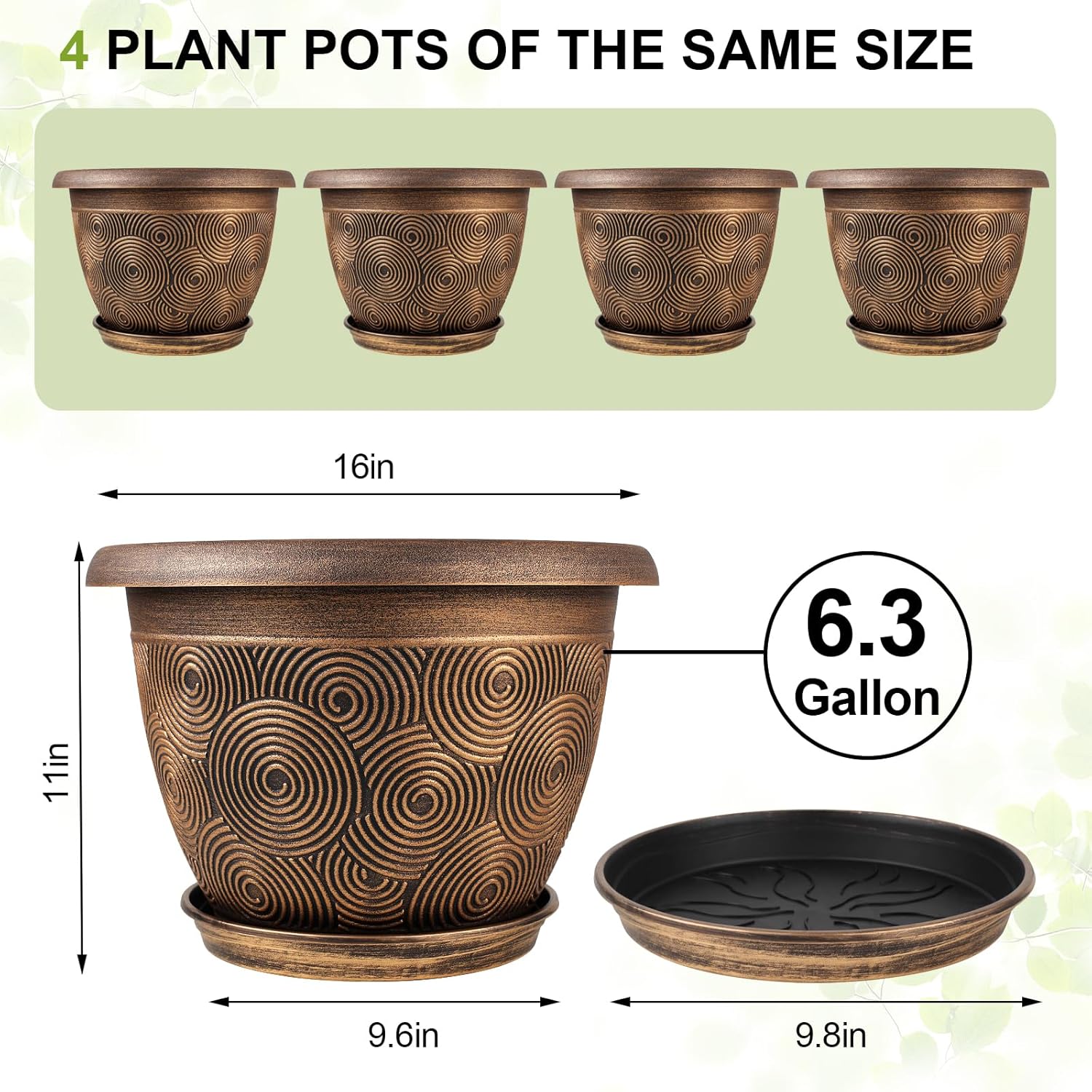 • 【Rolled Rim】Plastic flower pot for indoor plants are designed in rolled rim which helps you to easily move the container, even when it is full of soil. It won't break or crack when lifting. Top diameter: 16 inch, bottom diameter: 9.6 inch, height: 11 inch. Set of 4 pack 16 inch Solid plastic large planter pots are suitable for house plants, succulents, flowers, and cactus.