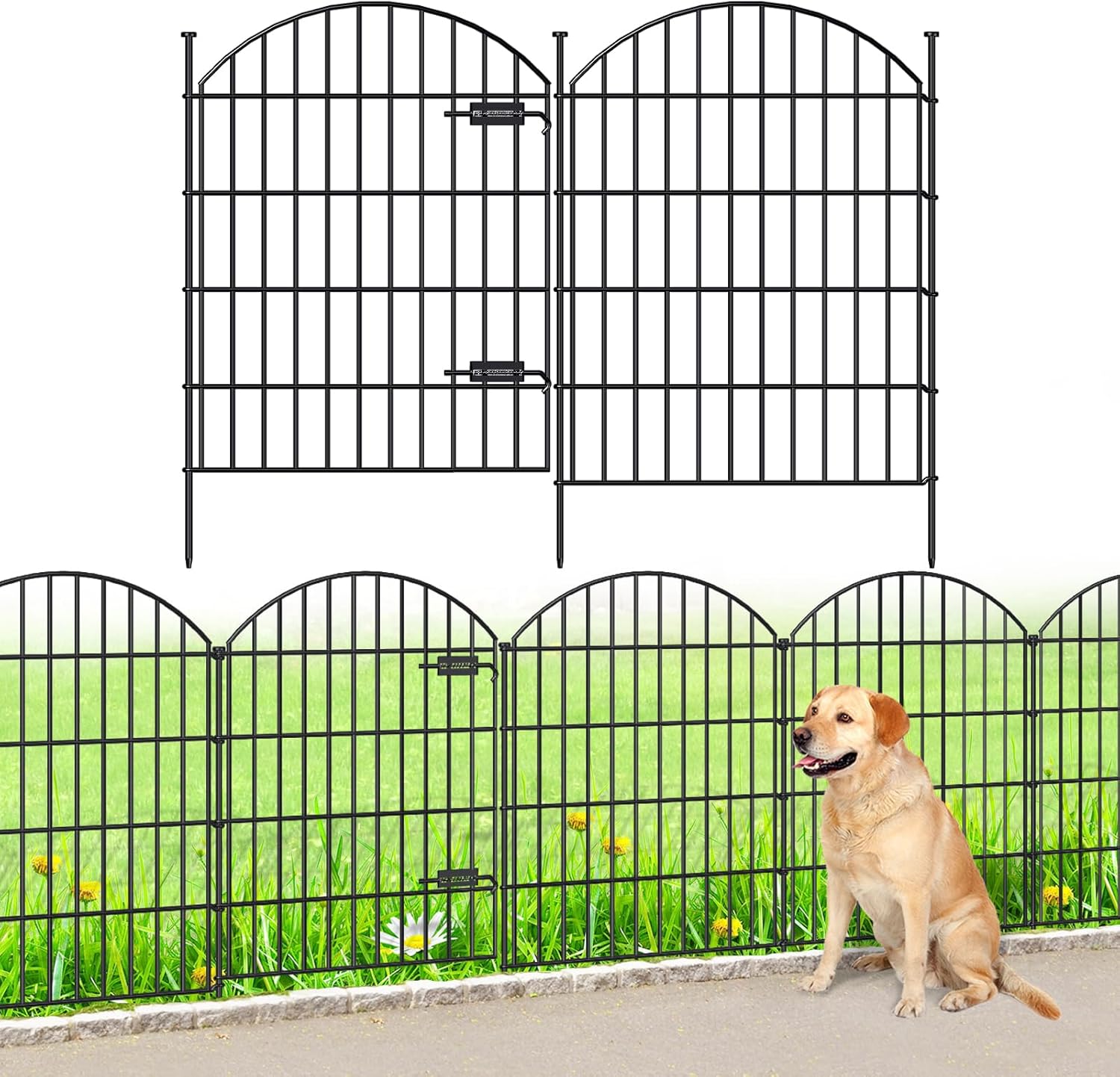 • STURDY AND STABLE: This garden gate and fences is welded by Gauge 9 thickness iron wires, the stakes are 10mm in diameter, and can be extended pretty far into the ground which is fairly steady, it works well as a fence with gate for big or medium size dogs.
