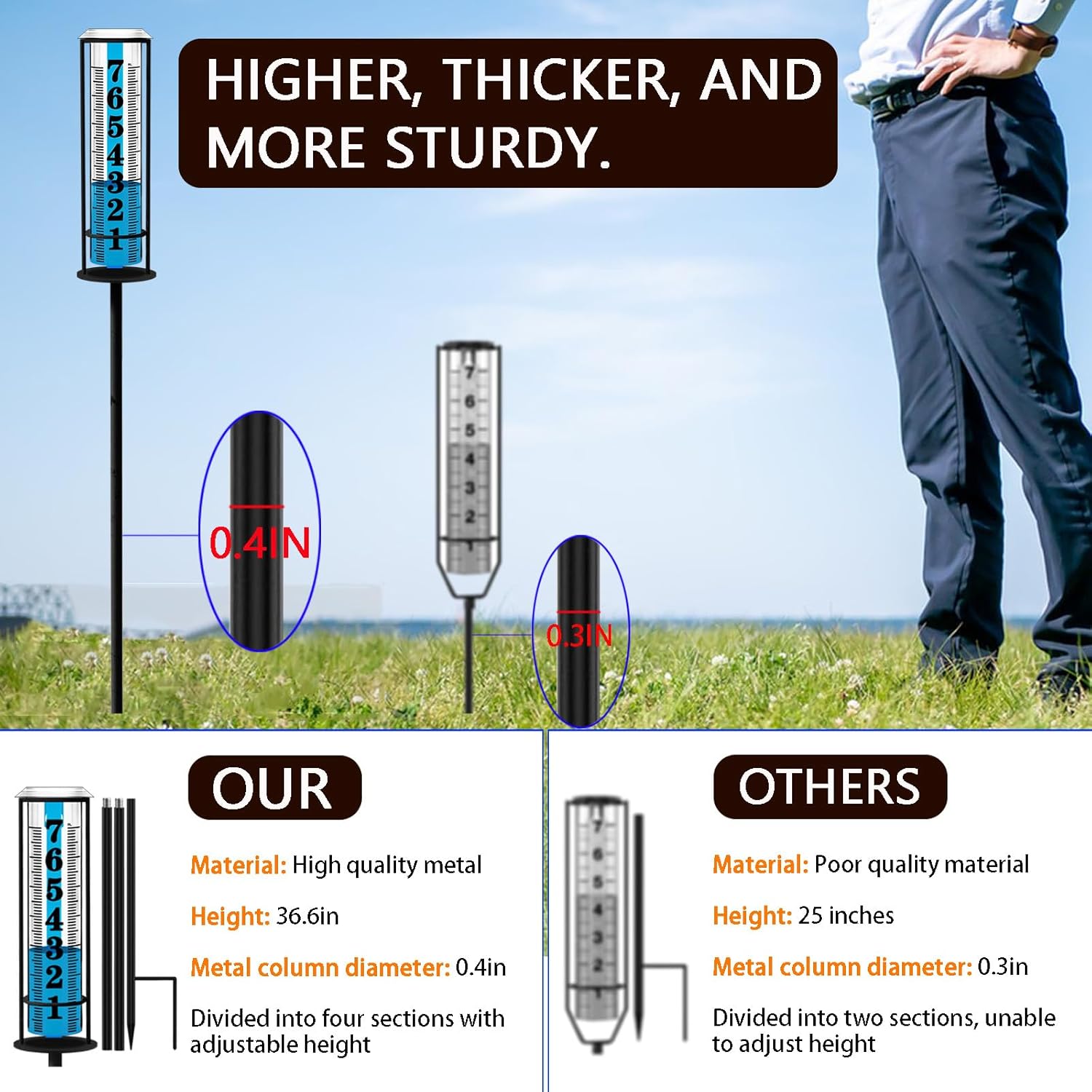 • 【4-Sections Adjustable Height】This large rain gauge outdoors best rated upgrade adopts a four-section design, and the overall height reaches 37 inches; You can also remove the middle section and adjust it to a height of 18 inches or 27 inches to meet your different needs. The height of 37inch is higher than other glass rain gauges on the market, so it is not easy to be covered by flowers and grass, and there is no need to squat down to read.