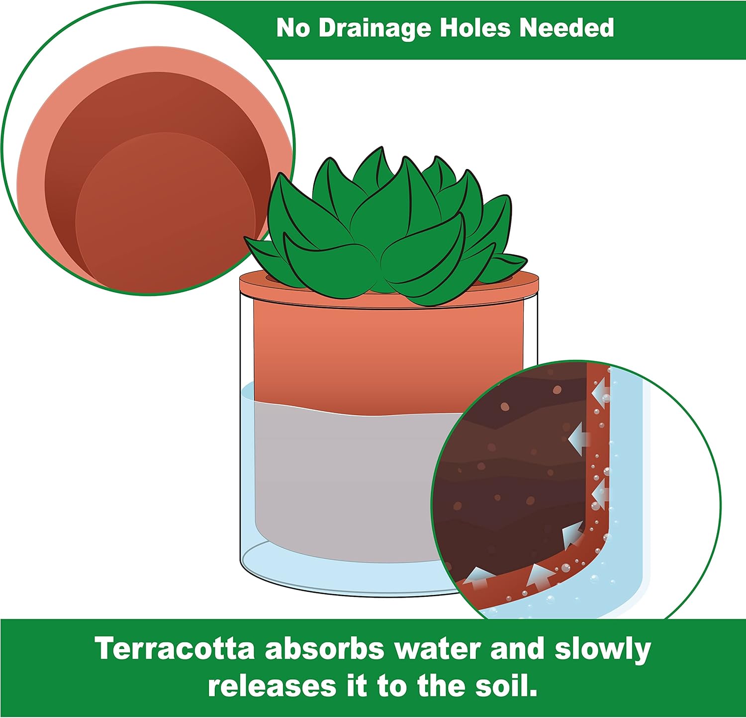 • Self-watering System: The terracotta pot is unglazed, just fill the glass container with water to ensure plants will absorb only what they need through the terracotta pot walls.