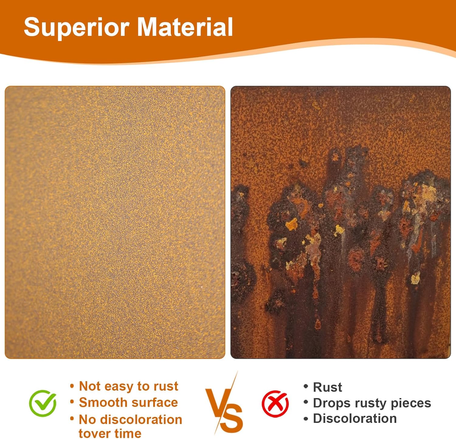 • 【Heavy-Duty Corten Steel】: Weathering steel will form a layer of iron rust effect on the surface after special process, which can protect the internal material from corrosion again, and at the same time, it has good oxidation resistance and corrosion resistance, thus prolonging the service life. Due to the design of its surface simulation of iron rust, no regular painting maintenance is required, and the maintenance cost is lower compared with ordinary steel, it should be noted that you need to wear gloves in the process of use