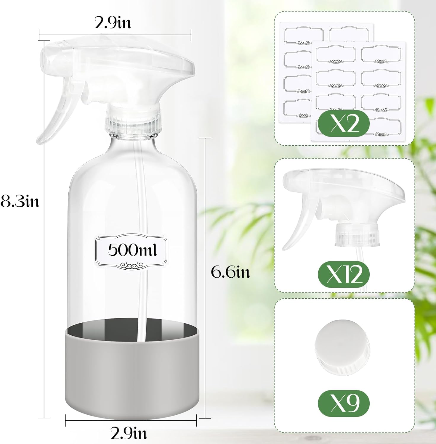 • Combo Containers Set: A complete package contains clear 16 oz bottles x 9, screw cone lids x 9, trigger nozzles x 12 and adhesive organizer labels x 16. You can place it on your livingroom or bathroom counter, sorting and labeling different liquid bottle at a glance