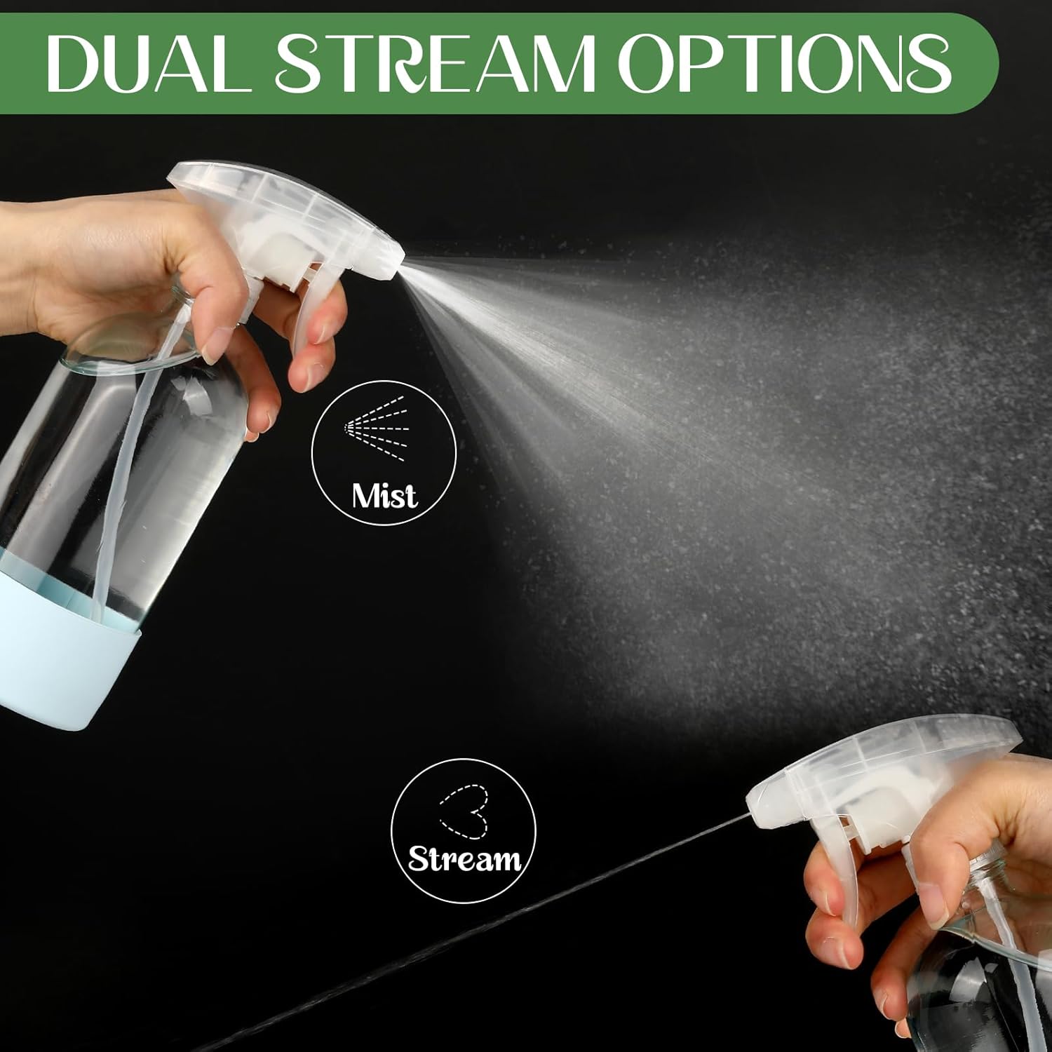 • Adjustable Dual Cap Nozzle: Upgraded nozzles x 12, tested to spray more than 100,000 times without crack, we are equipped with three settings: mist, stream, or off option, each spray bottle can pump liquid uniformly for the best coverage area and reach