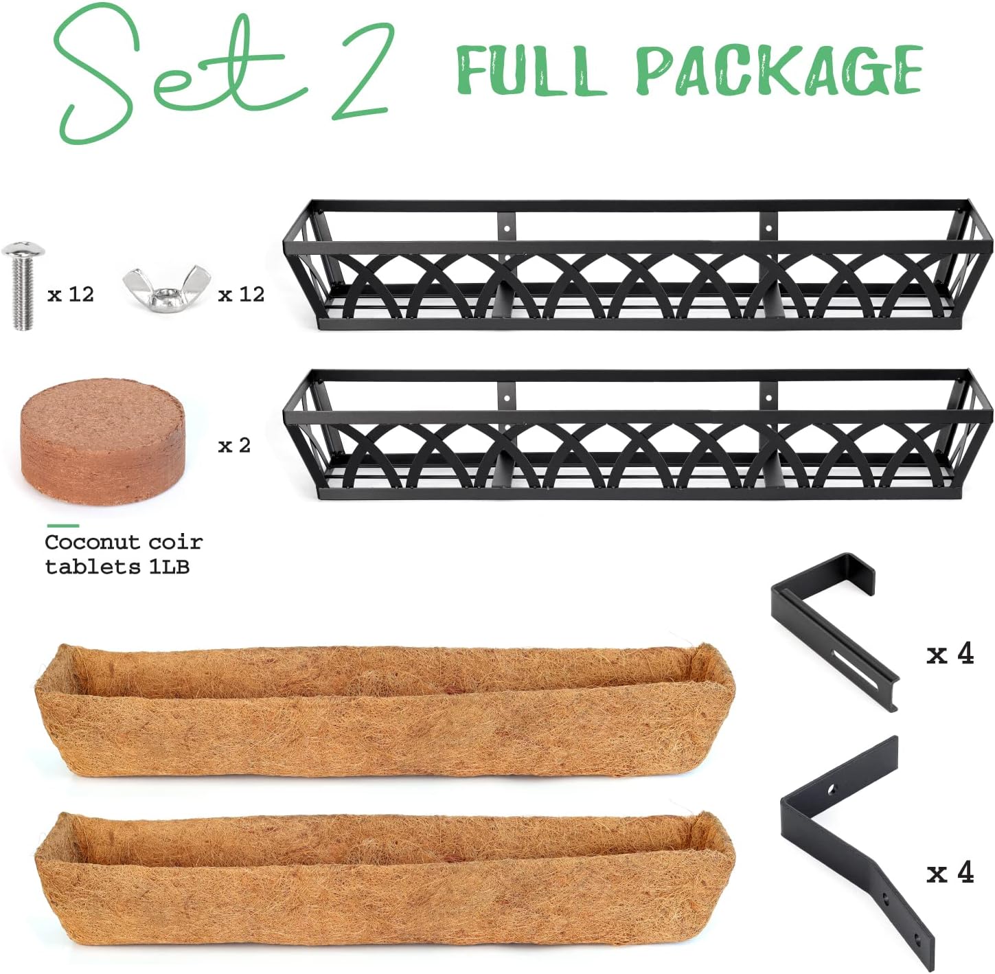 Window Box Railing, 36 Inch Black Metal Hanging Flower Planter Basket with Coco Liner for Outdoor Balcony Porch Fence Patio for Home, Office and Hotel (Black - 2 Pcs/Set)