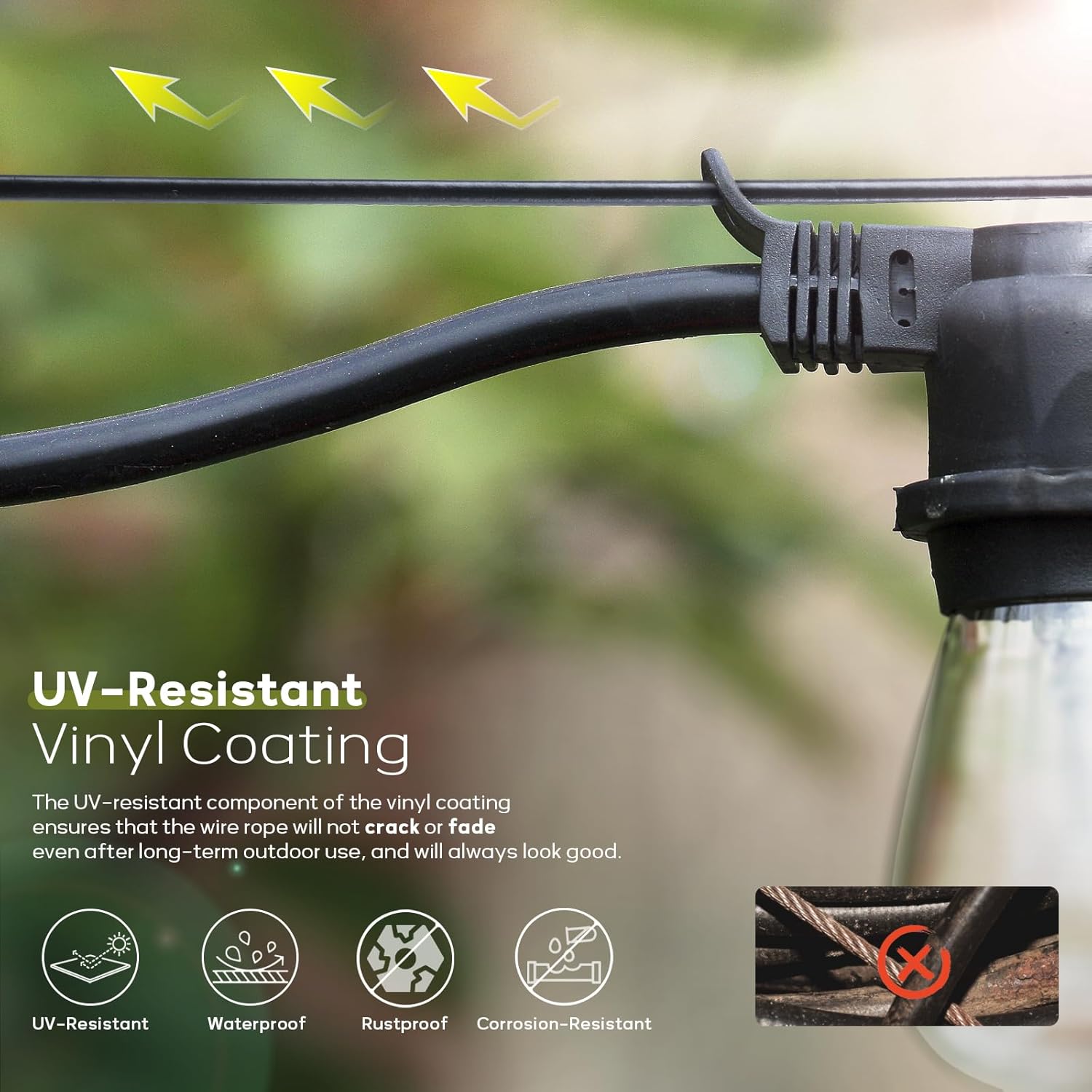 • UV Resistant Steel Wire Rope: The T304 wire rope is coated with vinyl through an injection molding process, making it smooth and gentle on your hands. It boasts excellent waterproof, rust, and corrosion resistance. The added UV-resistant ingredient ensures the cable won't crack or fade, even after prolonged outdoor use, keeping your beautifully decorated garden looking fresh