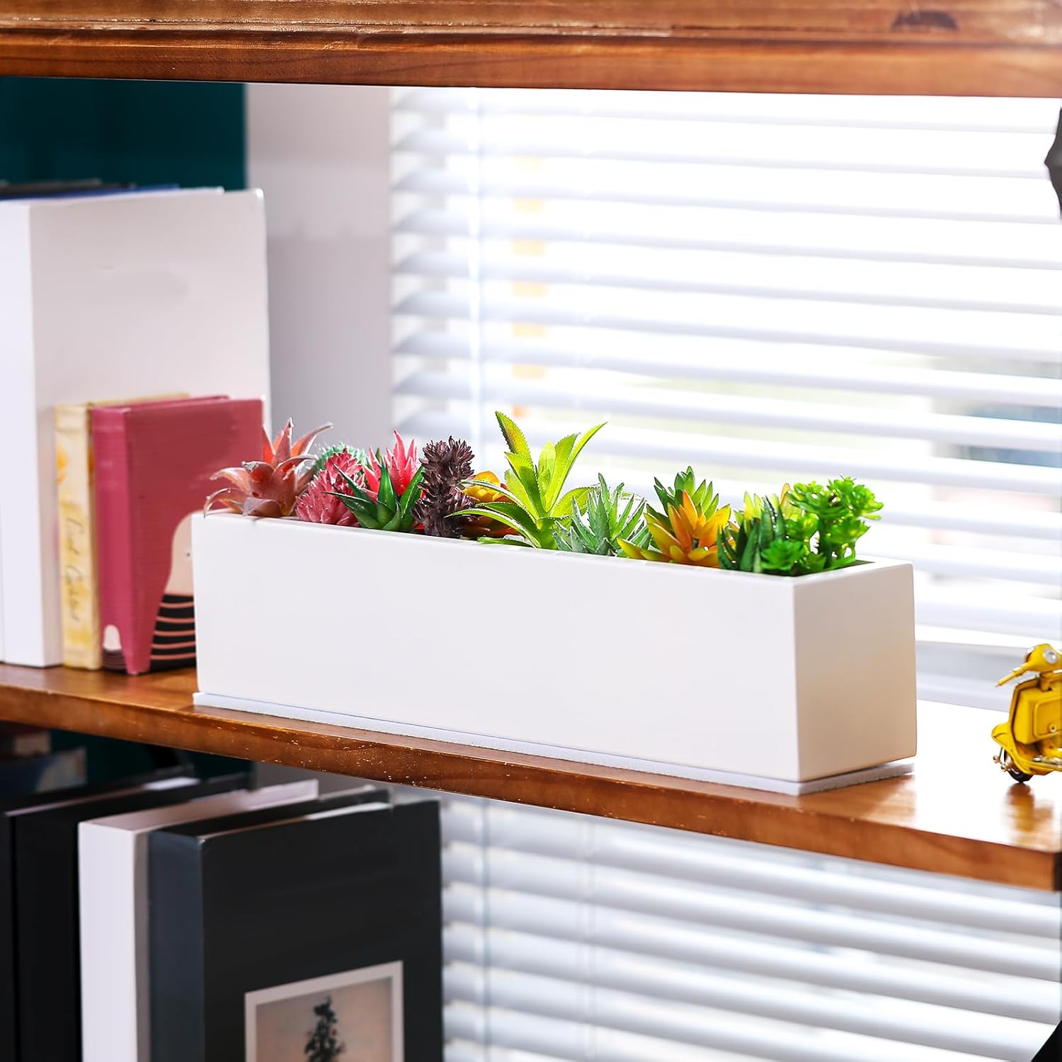 • Versatility: this rectangle plant pot can be applied as a large succulent planter indoors or as a pretty centerpiece on your table; Can be placed on the kitchen, balcony, bathroom windowsill, living room under the TV; It is a narrow flower box, can be easily placed on a bookshelf or table; You can grow cacti, succulents, flowers and other small houseplants, this long rectangular pot can also be applied to hold candles or other flower arrangements, good for your indoor or outdoor design needs