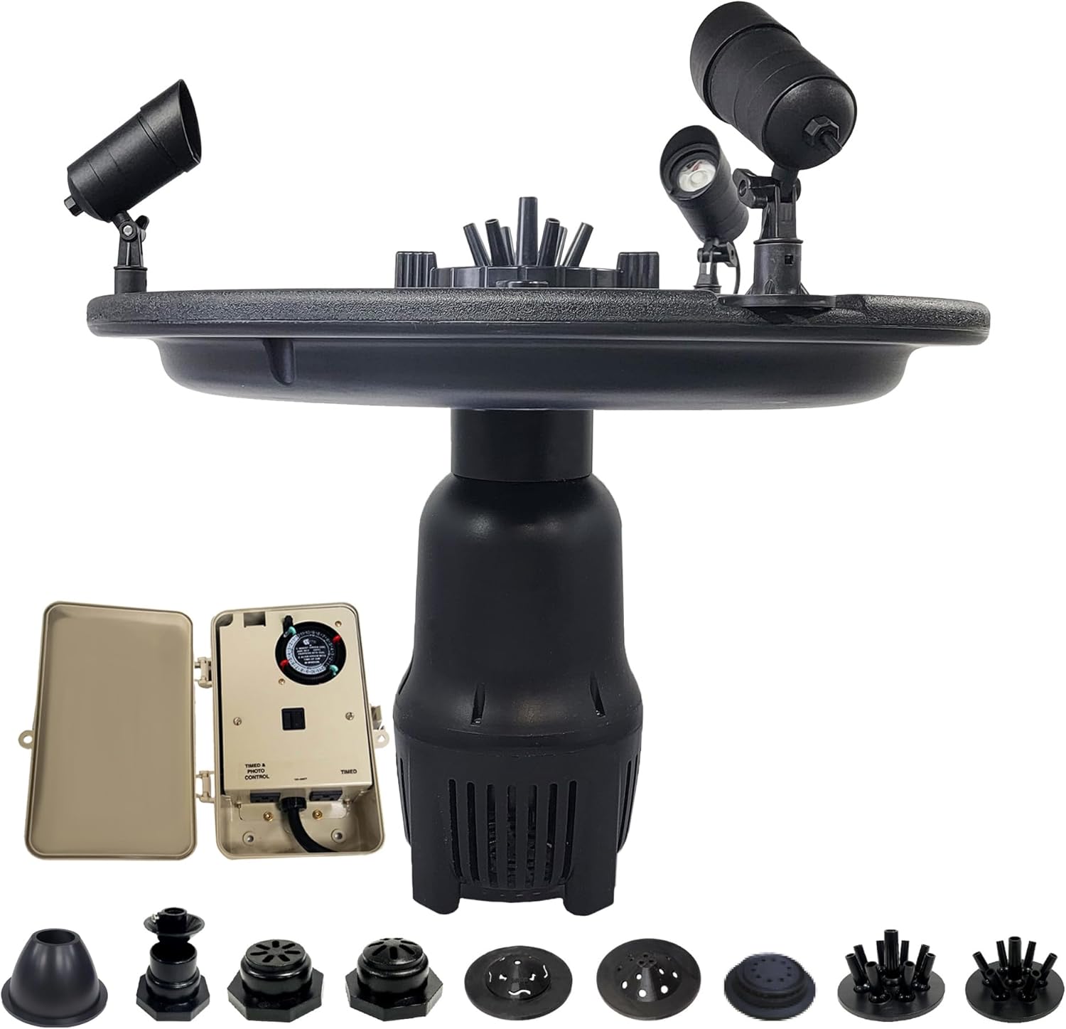 • Special Feature : 13 Spray Patterns, 200 Ft. Cord, Color Changing Lights, Control Box with Photo Cell and Timer