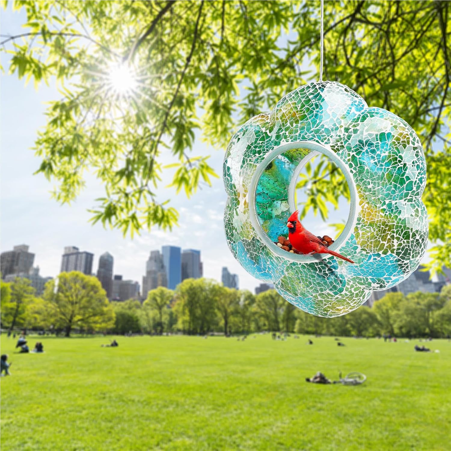 • 【Hanging Bird Feeder】Mosaic hang bird feeders for outdoors is made of strong mortar and glass. Birds can eat from the rim or hop inside during bad weather