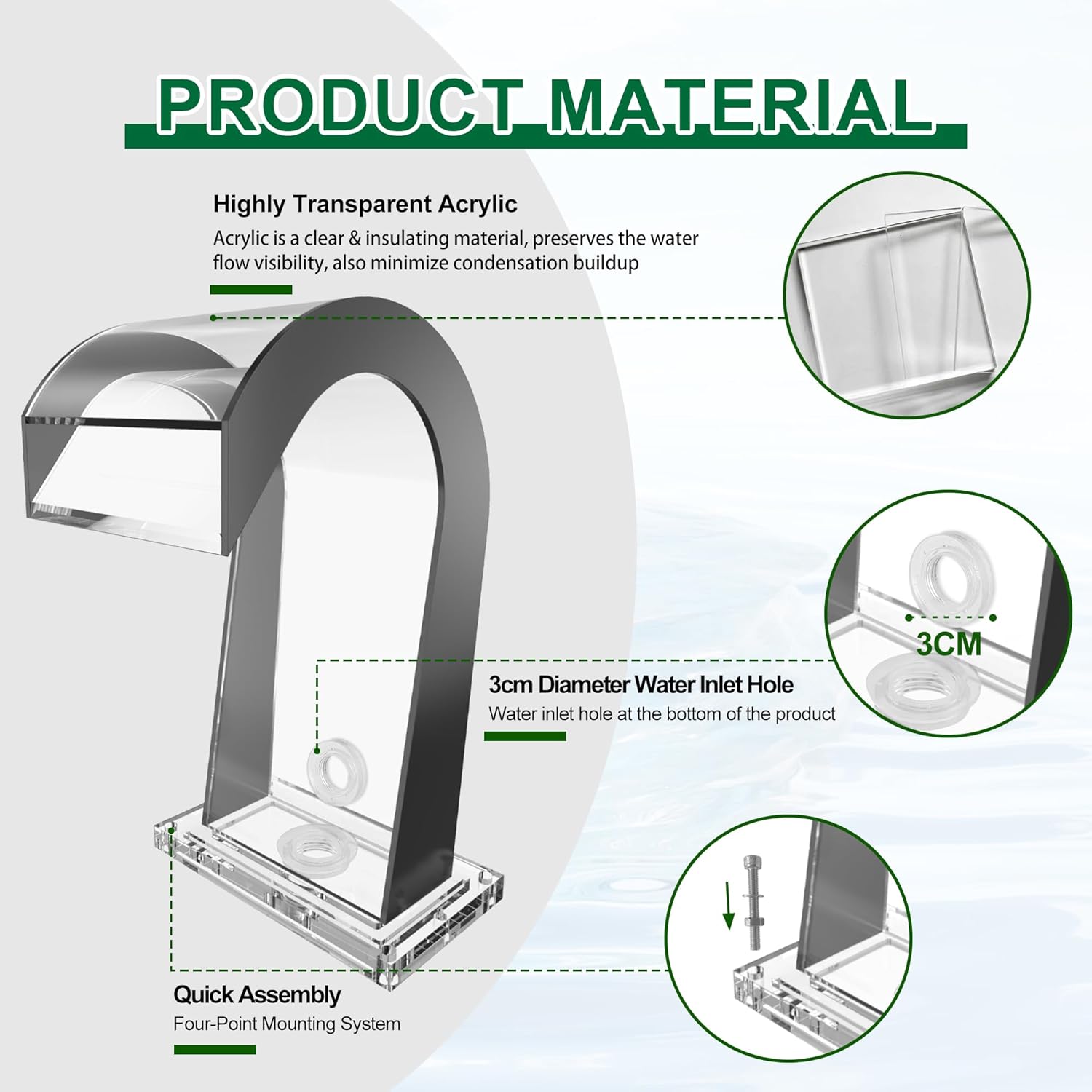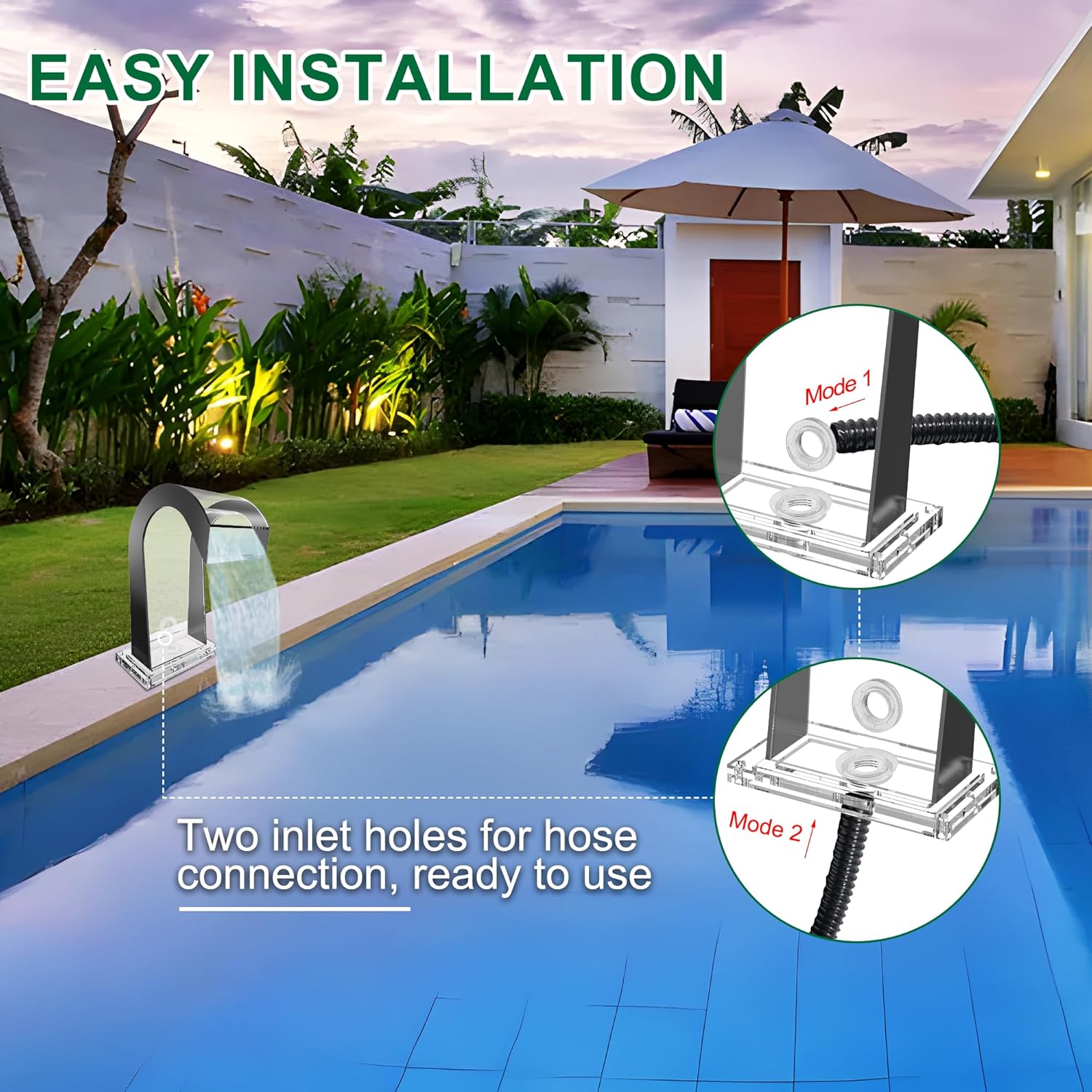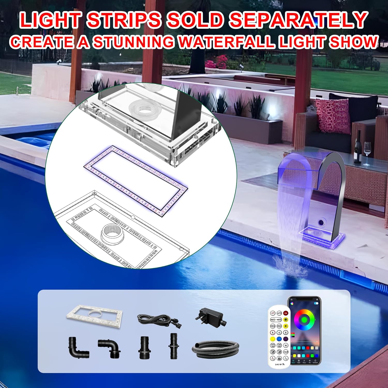 • One Year Replacement Committment: This elegant pool fountian requires a separately obtained pump for operation. We stand behind our products, and our dedicated support team is available to address inquiries regarding this product, offering prompt responses within a day. Please browse our other products for pool fountain accessories in our store. Waterfall only. LED light strips additional purchase.