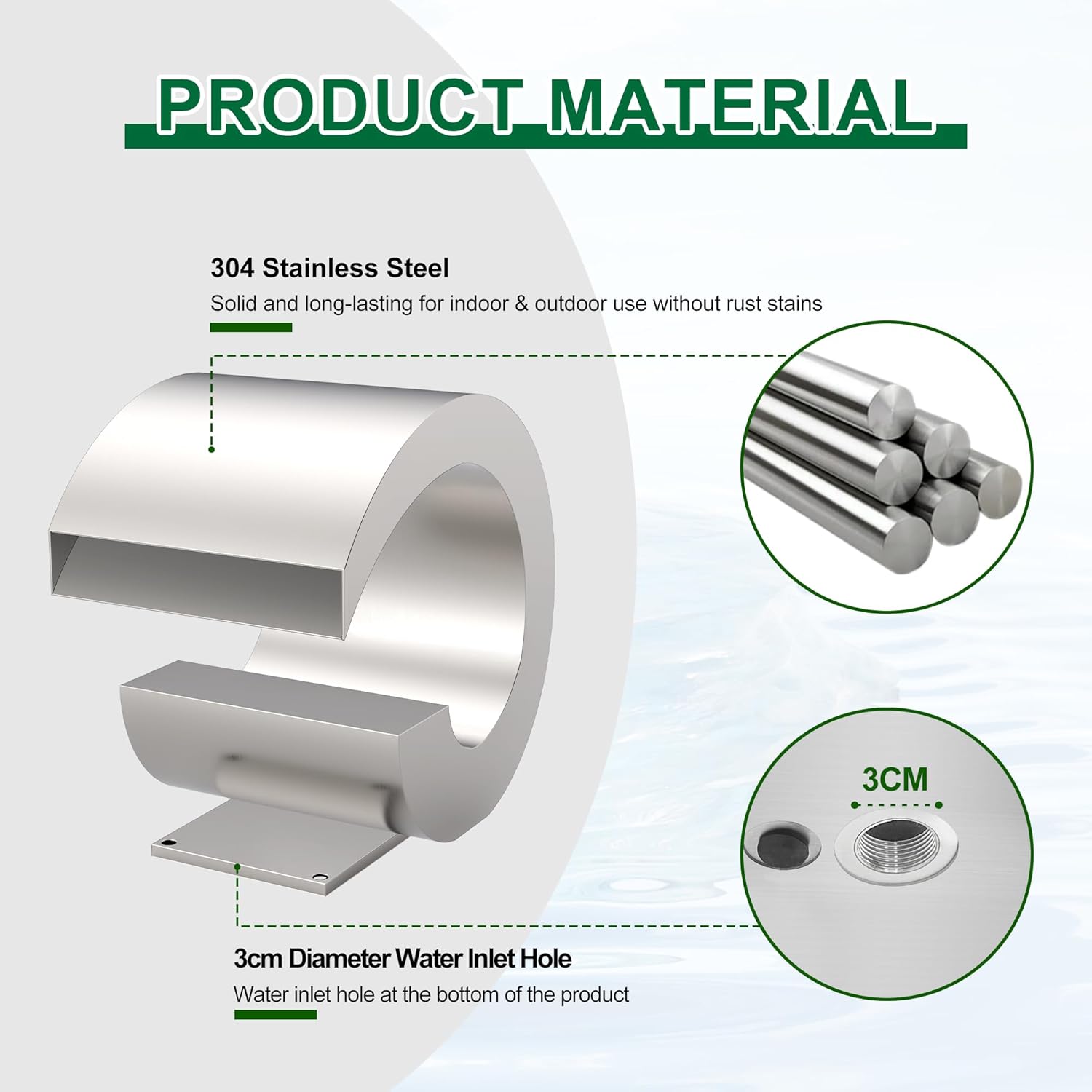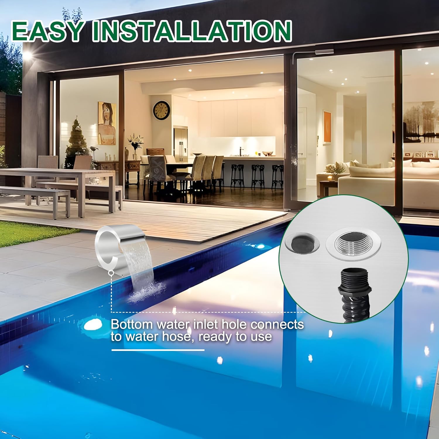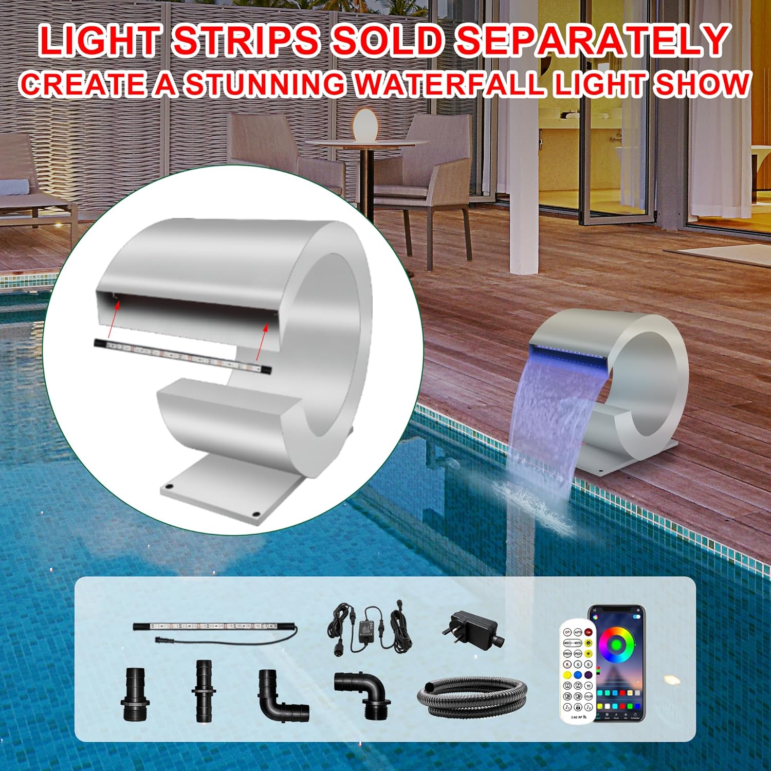 • One Year Replacement Committment: This elegant pool fountian requires a separately obtained pump for operation. We stand behind our products, and our dedicated support team is available to address inquiries regarding this product, offering prompt responses within a day. Please browse our other products for pool fountain accessories in our store. Waterfall only. LED light strips additional purchase.