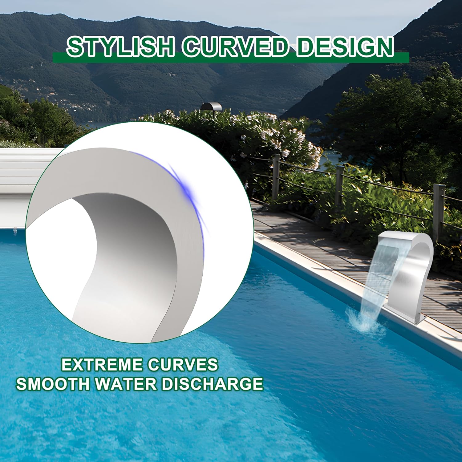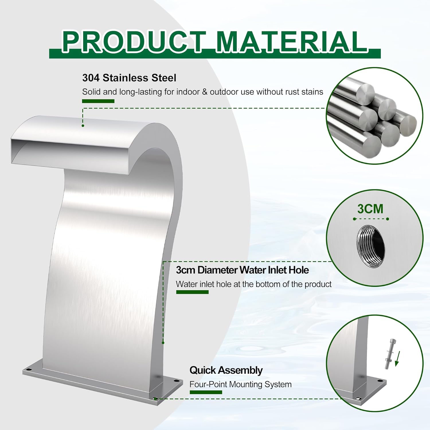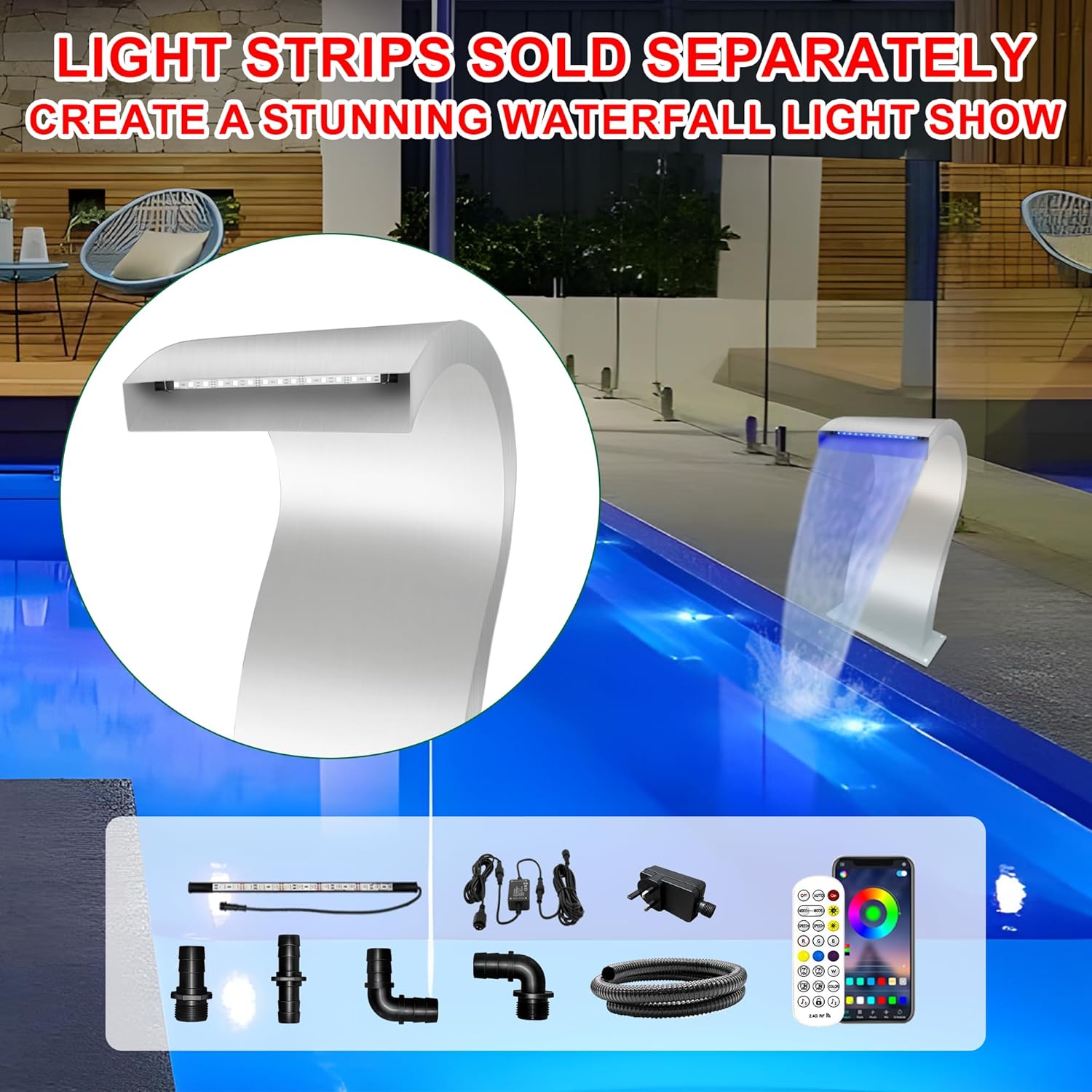 • One Year Replacement Committment: This elegant pool fountian requires a separately obtained pump for operation. We stand behind our products, and our dedicated support team is available to address inquiries regarding this product, offering prompt responses within a day. Please browse our other products for pool fountain accessories in our store. Waterfall only. LED light strips additional purchase.