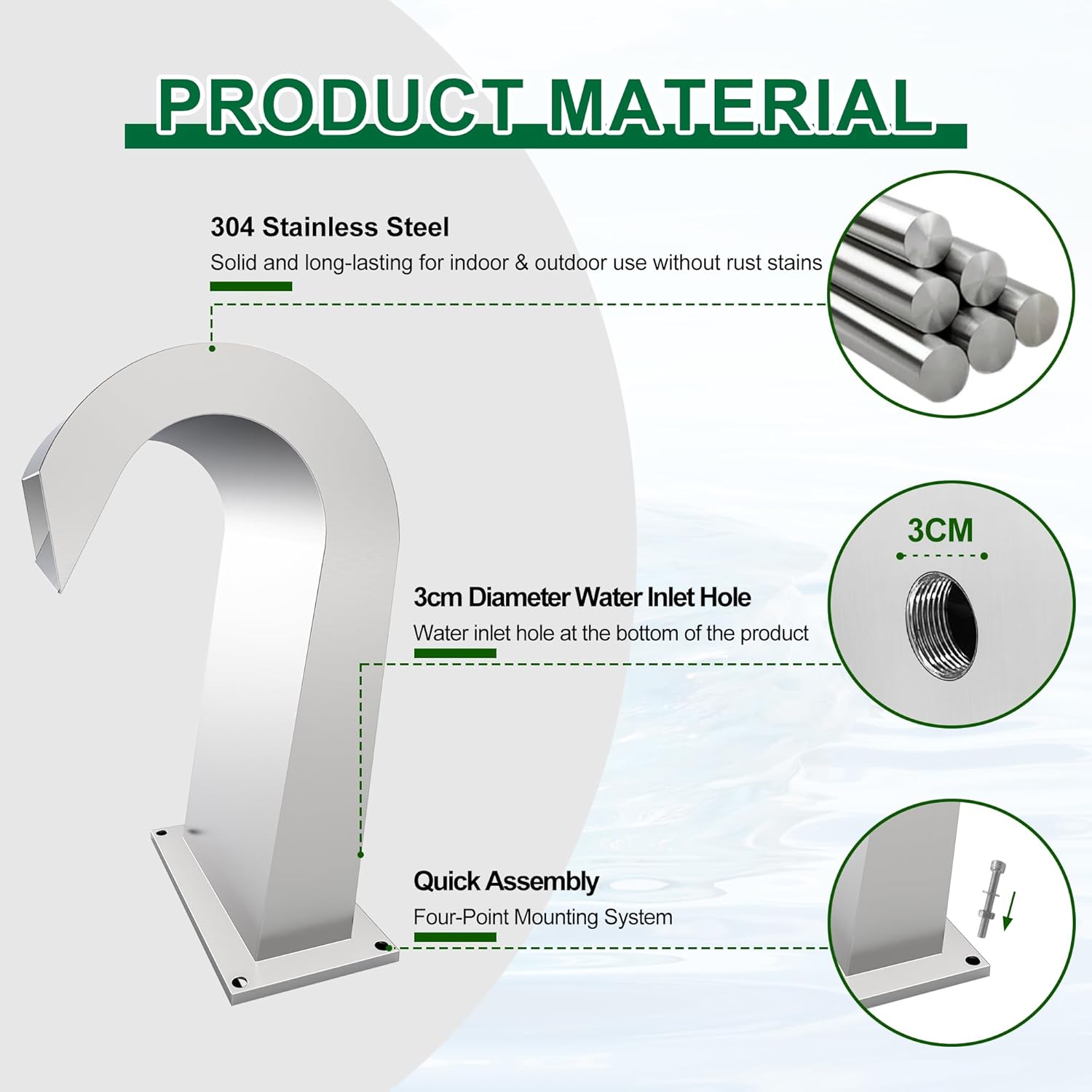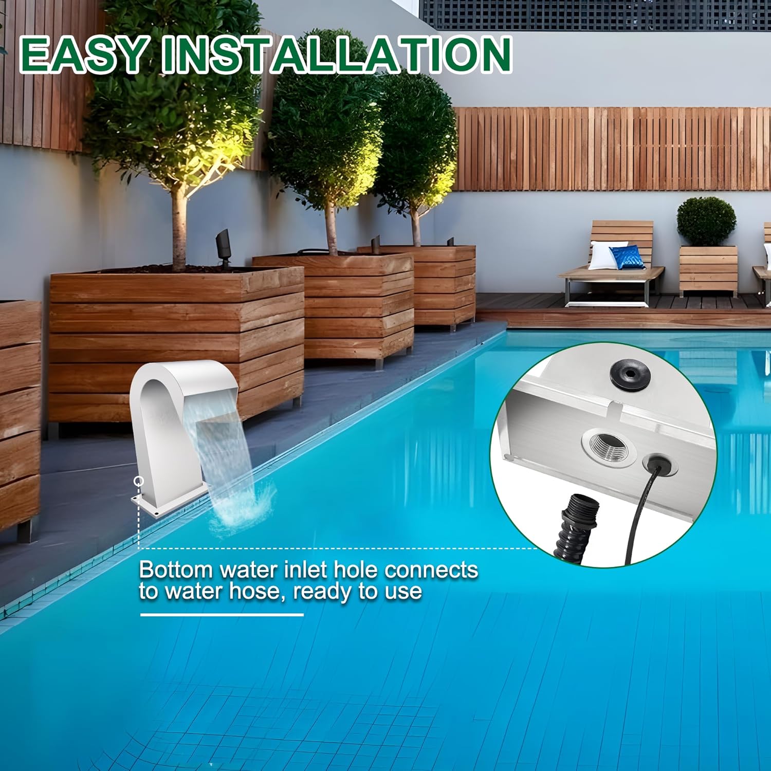 • One Year Replacement Committment: This elegant pool fountian requires a separately obtained pump for operation. We stand behind our products, and our dedicated support team is available to address inquiries regarding this product, offering prompt responses within a day. Please browse our other products for pool fountain accessories in our store. Waterfall only. LED light strips additional purchase.