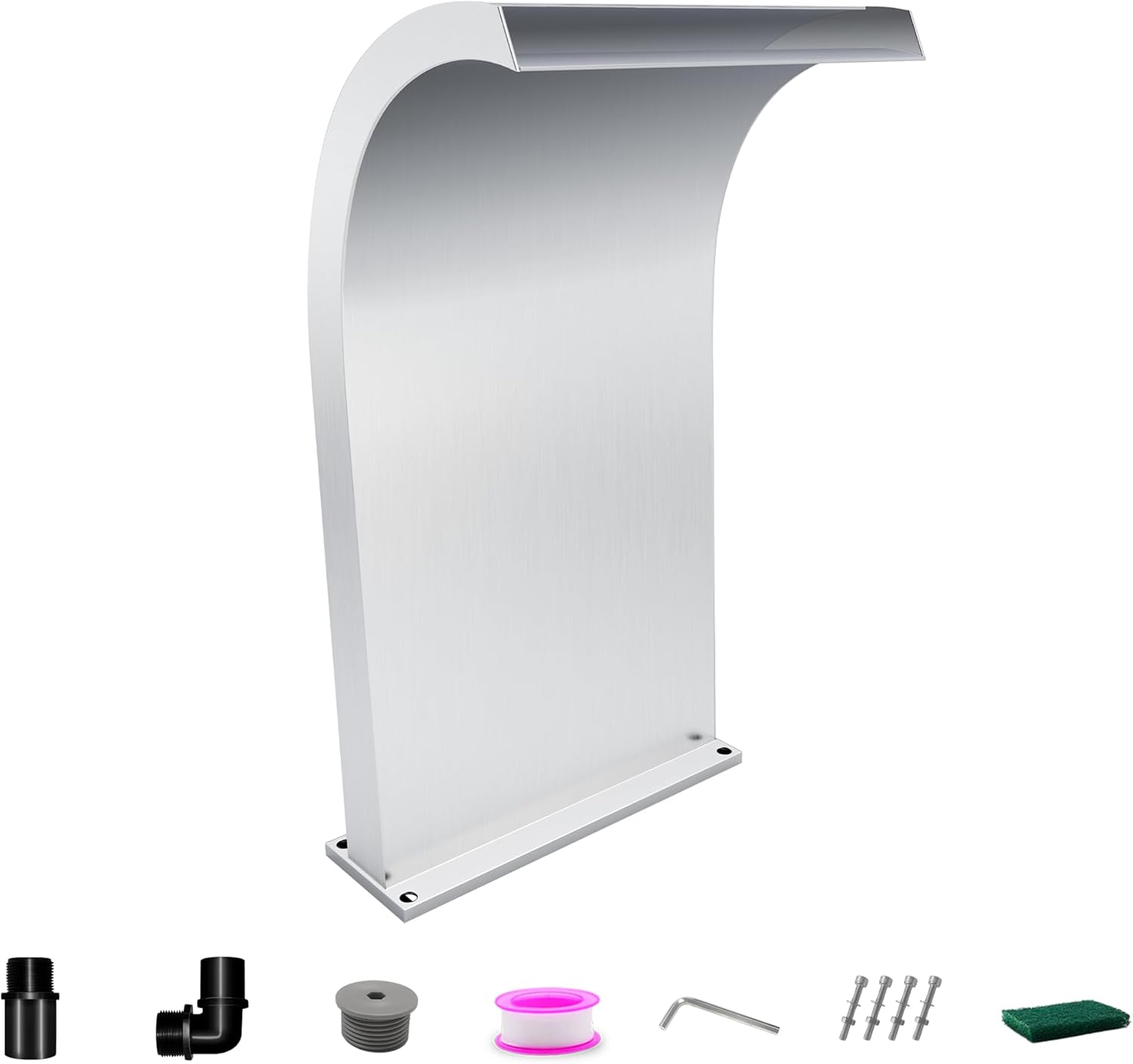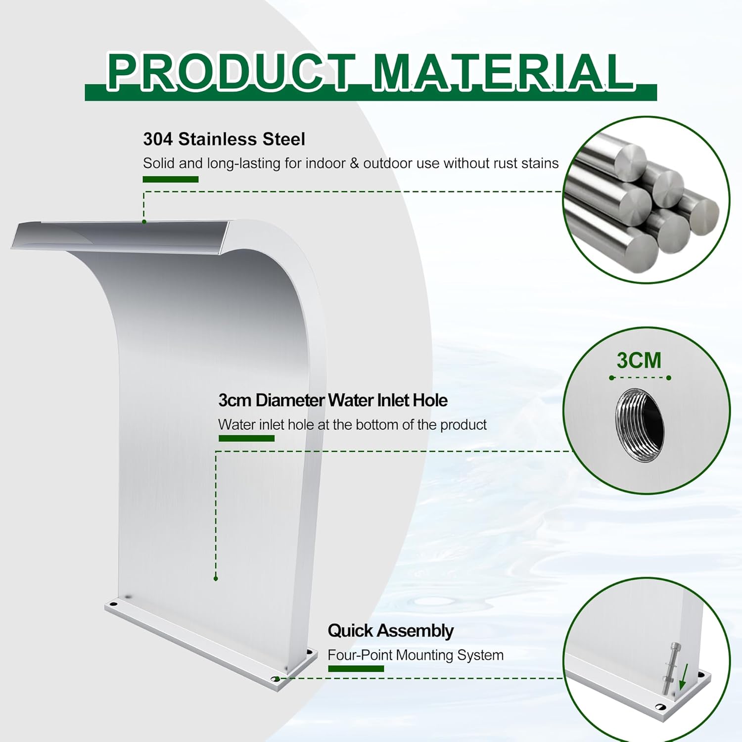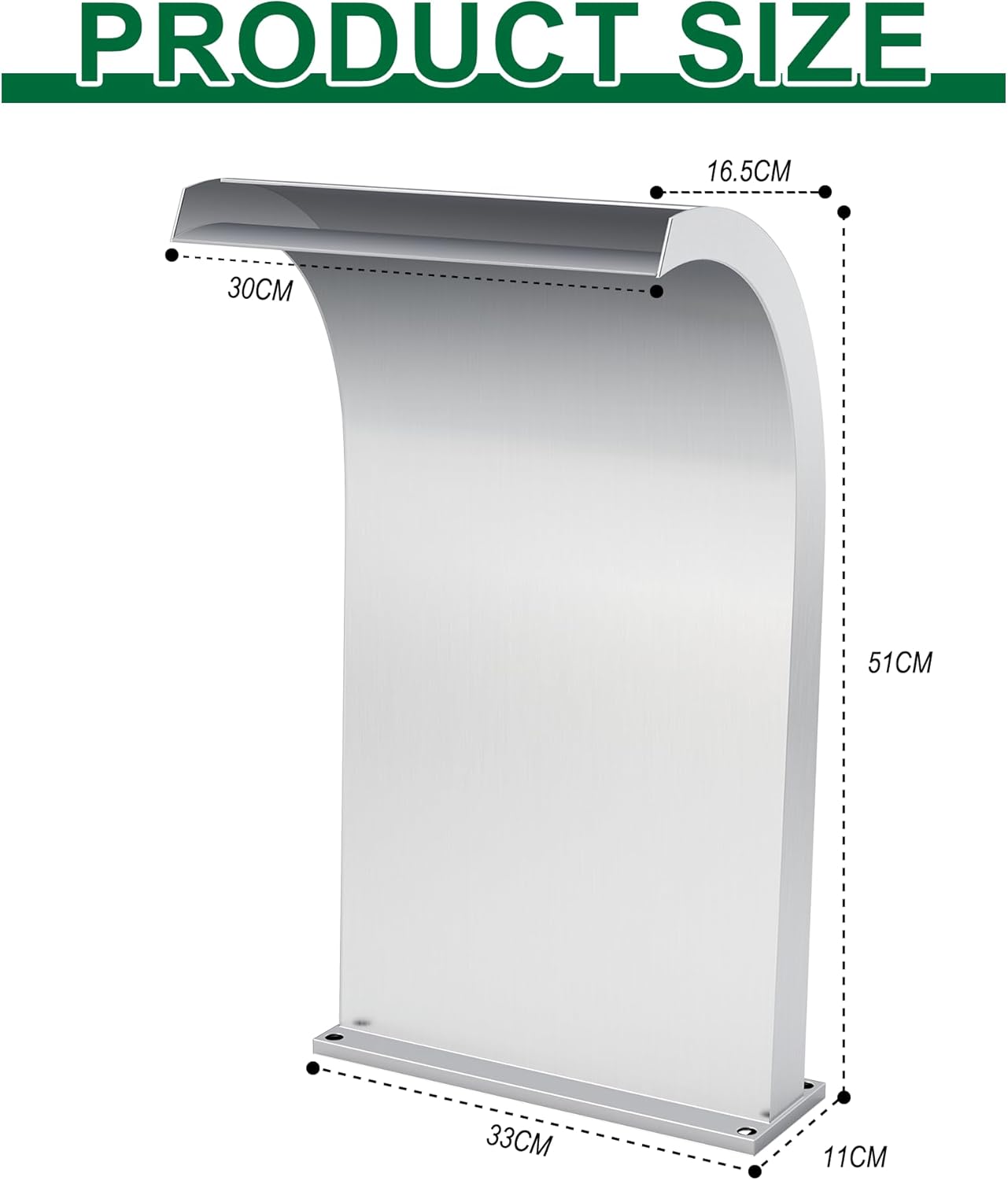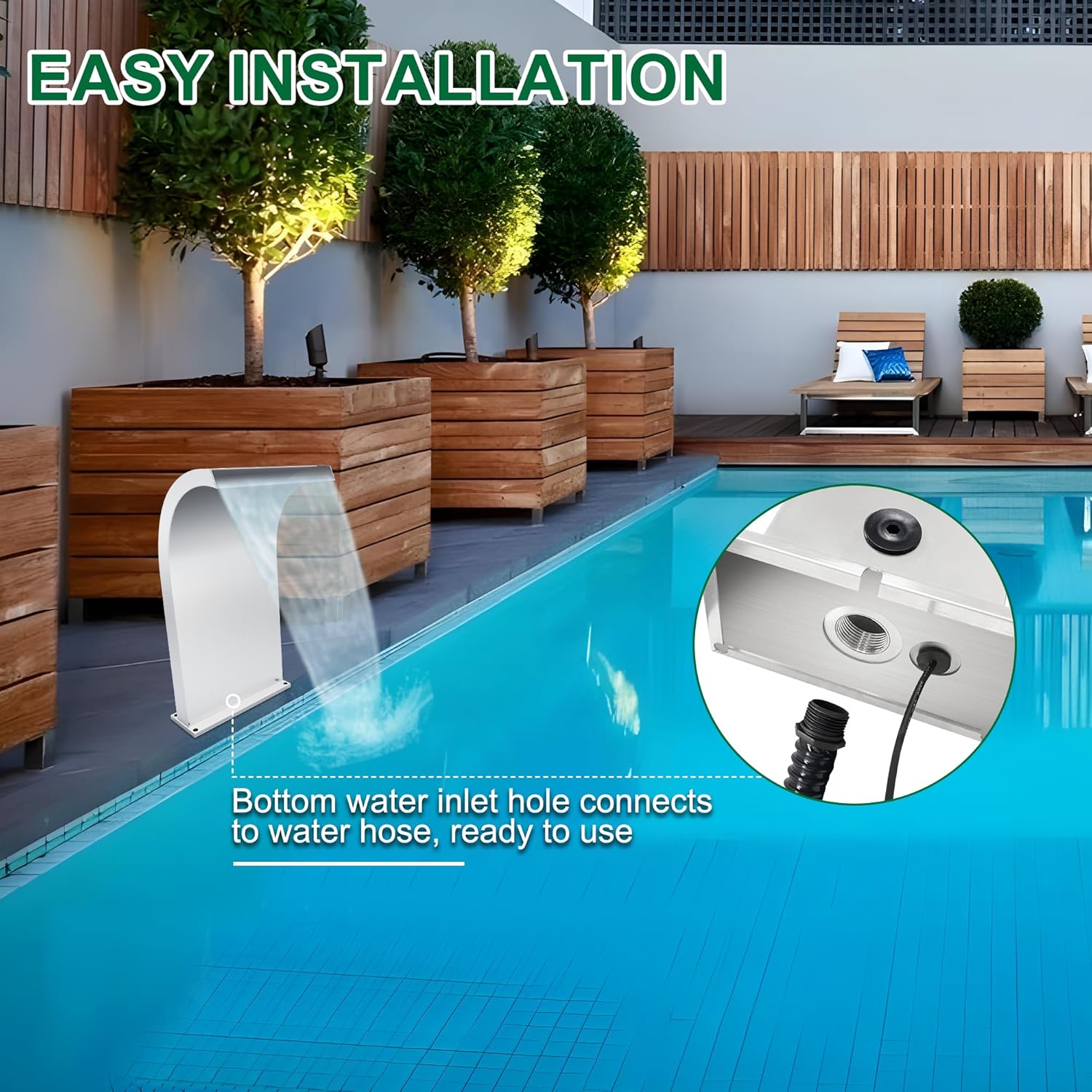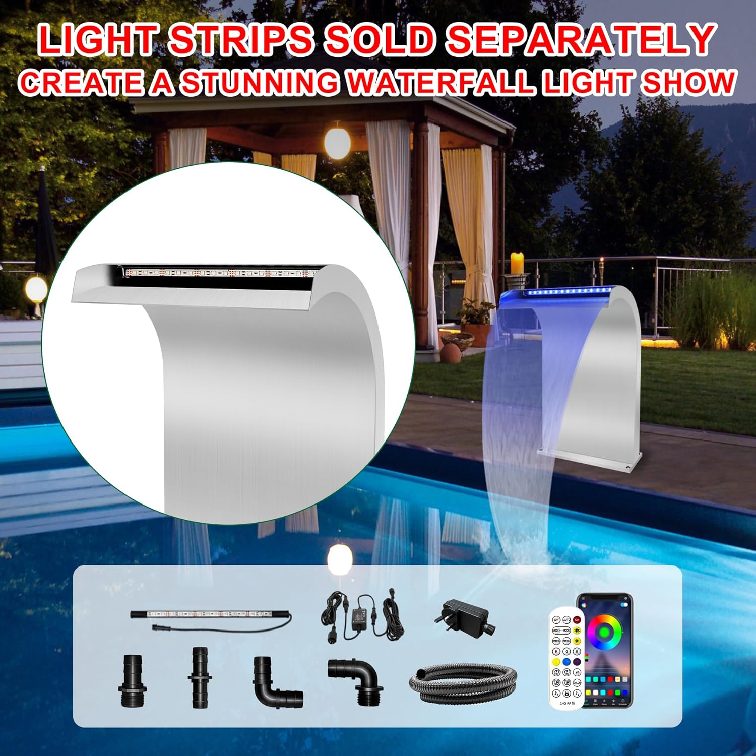 • One Year Replacement Committment: This elegant pool fountian requires a separately obtained pump for operation. We stand behind our products, and our dedicated support team is available to address inquiries regarding this product, offering prompt responses within a day. Please browse our other products for pool fountain accessories in our store. Waterfall only. LED light strips additional purchase.
