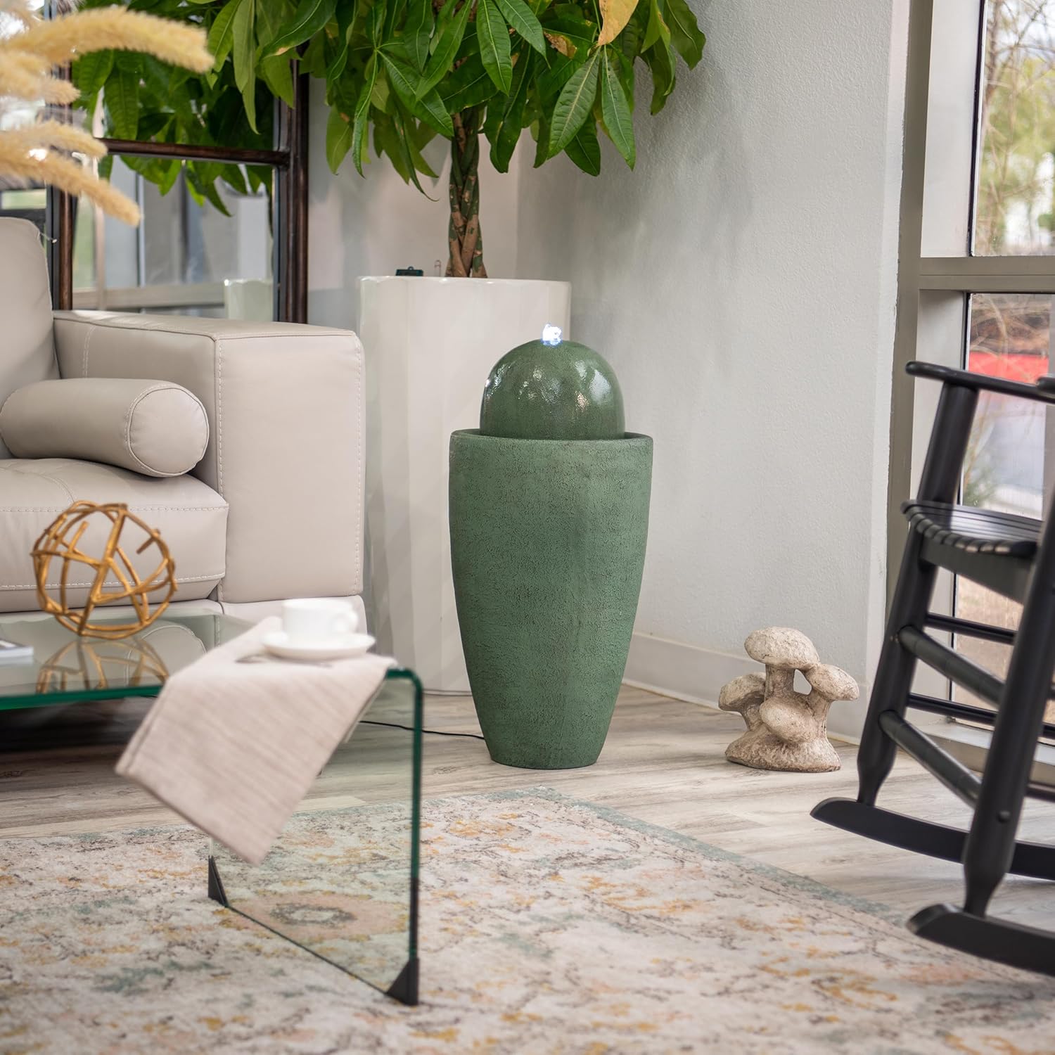 XBrand 25.98" H Round Stone Indoor/Outdoor Modern Stone Textured Sphere Water Fountain w/LED Lights, Ball Fountain Decor, Green